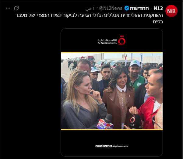 ونفس السياق نشر الحساب الرسمي للقناة الـ12 الإسرائيلية، عبر حسابها بمنصة "إكس" صورة للممثلة الأمريكية أنجلينا جولي، وهي عند معبر رفح، مأخوذة من بث قناة القاهرة الإخبارية.