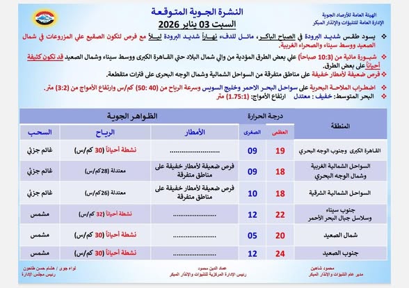 يتوقع خبراء هيئة الأرصاد الجوية أن يسود، اليوم السبت، طقس شديد البرودة في الصباح الباكر، مائل للدفء نهارا، شديد البرودة ليلا على أغلب الأنحاء مع فرص لتكون الصقيع على المزروعات في شمال الصعيد ووسط سيناء والصحراء الغربية.