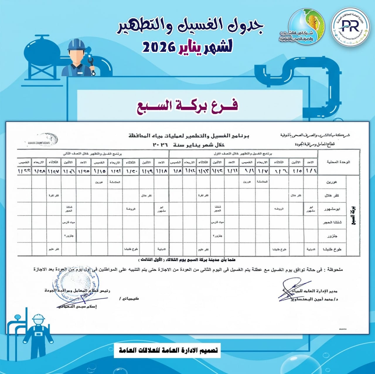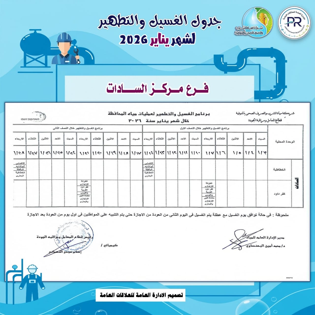 أعلن المهندس رشدي السيد عمر ، رئيس شركة مياه الشرب والصرف الصحى بالمنوفية، خطة غسيل شبكات المياه بكافة مناطق المحافظة خلال شهر يناير 2026م وفقًا للمناطق المحددة بجدول الغسيل الدورى للشبكات .