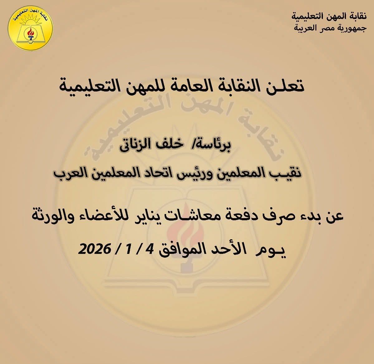 أعلنت النقابة العامة للمهن التعليمية، برئاسة خلف الزناتي نقيب المعلمين ورئيس اتحاد المعلمين العرب، عن بدء صرف دفعة معاشات شهر يناير للأعضاء والورثة، اعتبارًا من اليوم الأحد الموافق 4 يناير 2026.