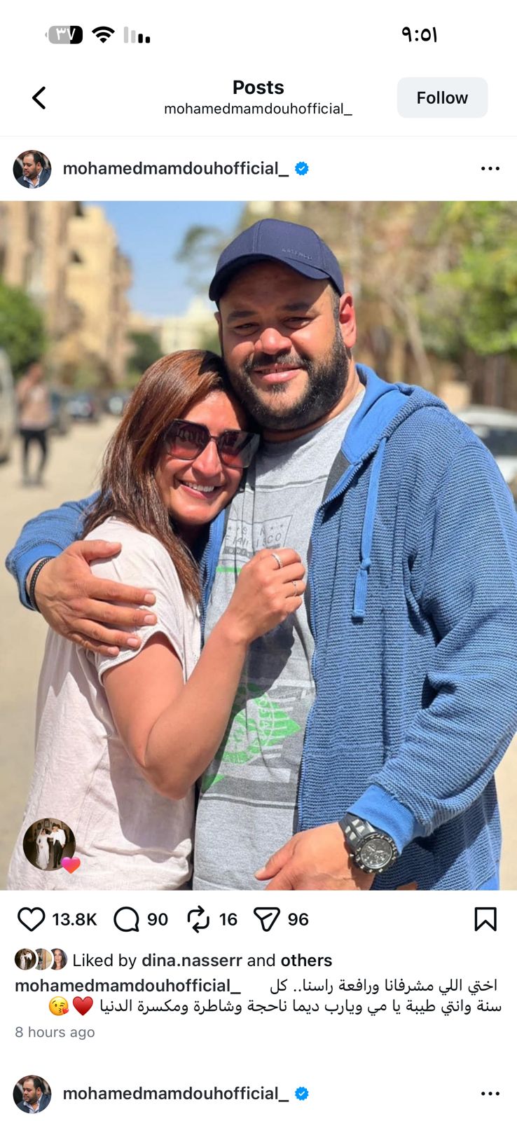 ونشر محمد ممدوح صورة تجمعه معاها عبر حسابه الرسمي على موقع «إنستجرام وعلق قائلا »: «أختي اللي مشرفانا ورافعة راسنا.. كل سنة وإنتِ طيبة يا مي، ويارب دايمًا ناجحة وشاطرة ومكسّرة الدنيا».
