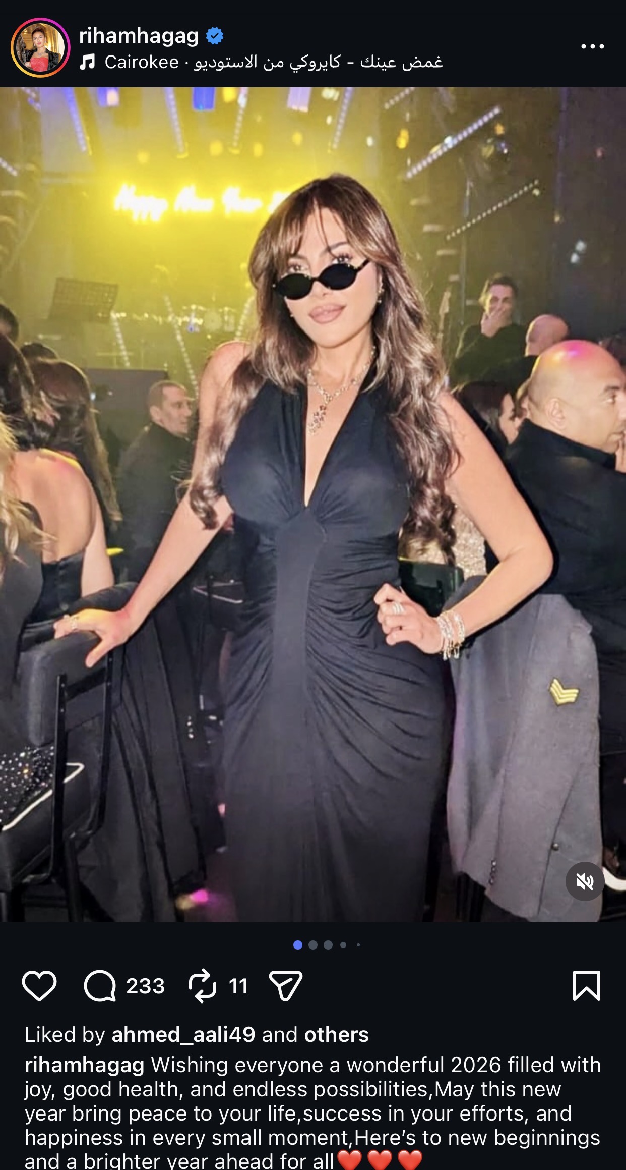 ونشرت ريهام صور لها عبر حسابها الشخصي بموقع إنستجرام أثناء احتفالها وعلقت عليها قائلة: "أتمنى للجميع عام 2026 رائع مليء بالفرح، الصحة الجيدة، وإمكانيات لا نهاية لها، أتمنى أن يجلب هذا العام الجديد السلام لحياتكم، النجاح في جهودكم، والسعادة في كل لحظة صغيرة، إليكم بداية جديدة وسنة أكثر إشراقًا للجميع."