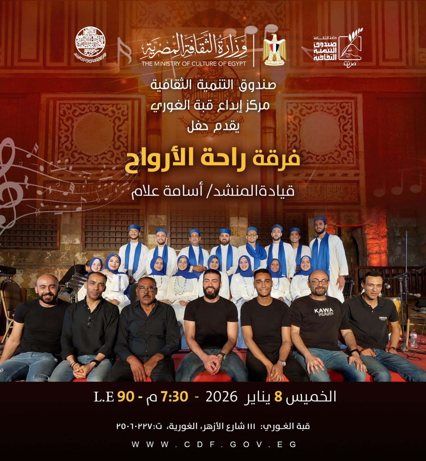 يقدّم قطاع صندوق التنمية الثقافية بوزارة الثقافة، من خلال مركز إبداع قبة الغوري بشارع الازهر، حفلًا فنيًا لفرقة راحة الأرواح، وذلك مساء الخميس 8 يناير.
