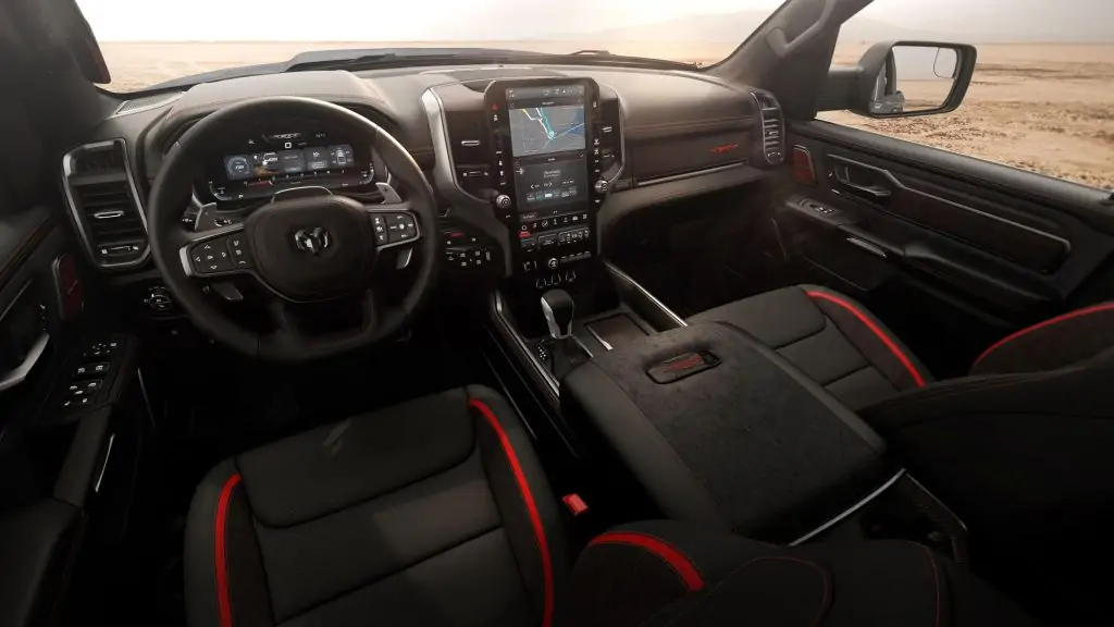 بالاضافة إلي ان سيارة رام SRT هيلكات TRX موديل 2026 بها، شبكة أمامية بـ شعار RAM عالي التدفق لضمان تبريد المحرك الجبار، وبها رسومات جانبية تعكس هوية الديناصور، وبها جلد ناتورا بلس والكانتارا، وتطريزات TRX حمراء، وبها لمسات من ألياف الكربون بخيوط حمراء مؤكسدة .