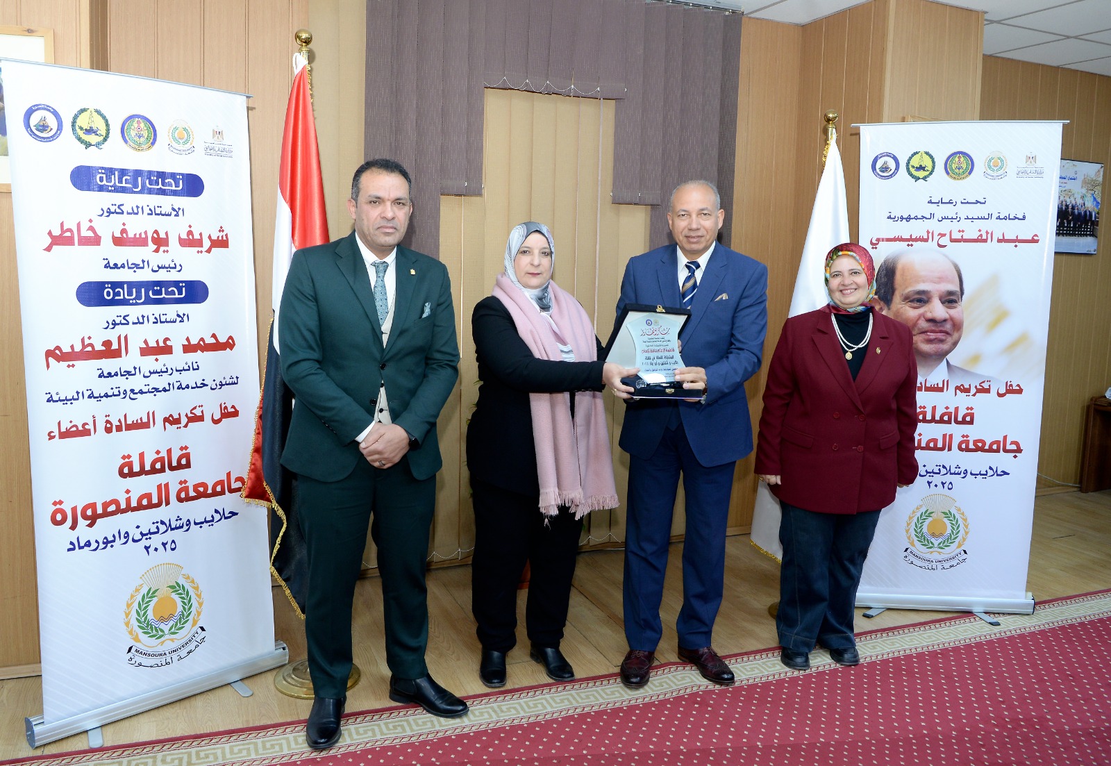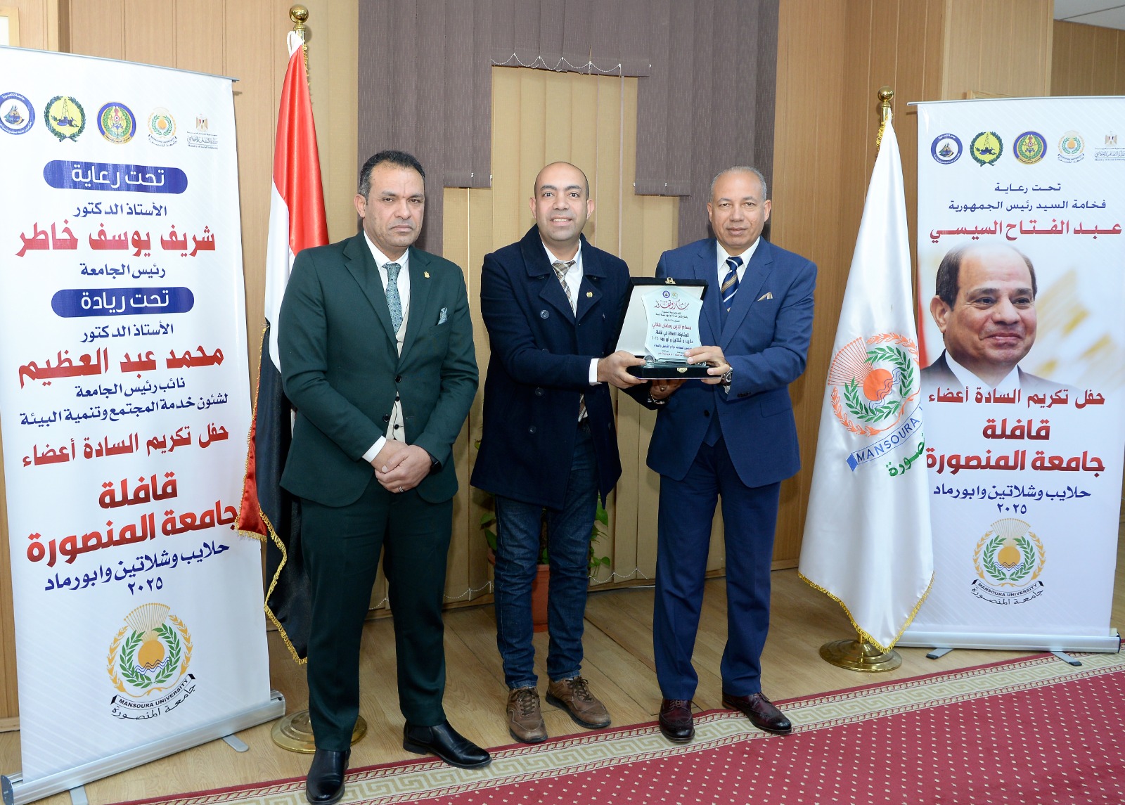 كرَّم الدكتور شريف خاطر، رئيس جامعة المنصورة، أعضاء القافلة التنموية الشاملة "جسور الخير 23"؛ تقديرًا لجهودهم وعطائهم المخلص في خدمة أهالي مدن حلايب وشلاتين وأبو رماد بمحافظة البحر الأحمر، وقد جرى التكريم خلال احتفالية نُظِّمَت اليوم بقاعة مجلس الجامعة.