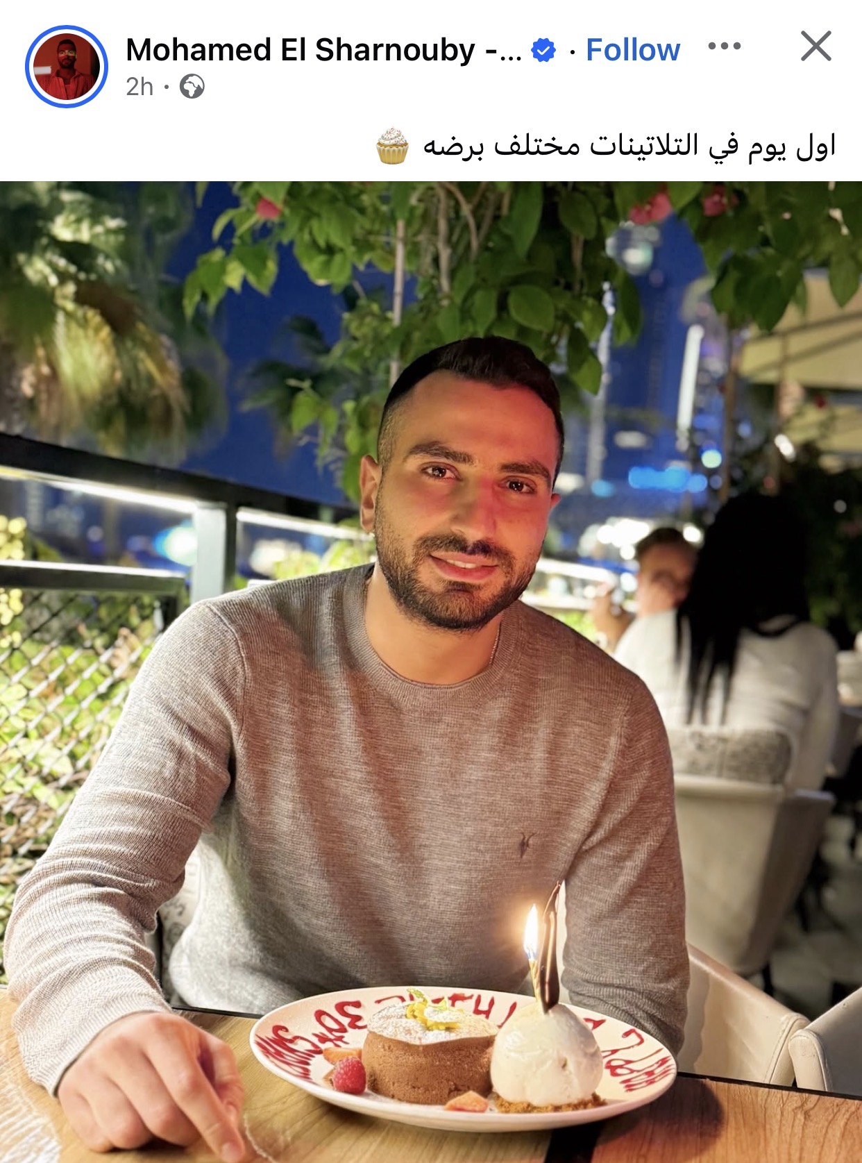 احتفل الفنان محمد الشرنوبي، بعيد ميلاده في أجواء هادئة ونشر صورة عبر حسابه الشخصي بموقع فيسبوك من الاحتفال وعلق عليها قائلاً: "أول يوم في التلاتينات مختلف برضو".