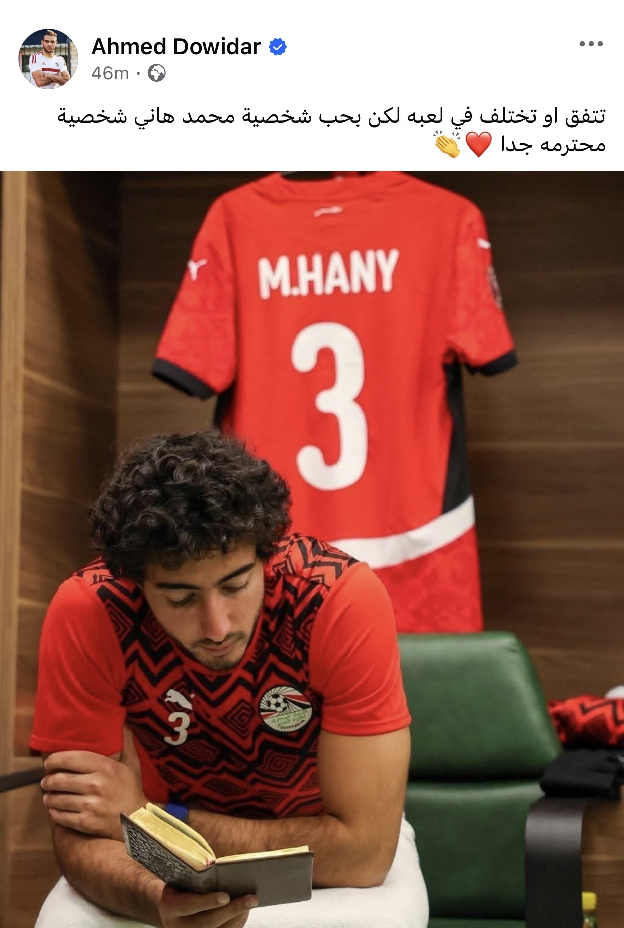 وكتب دويدار عبر حسابه الشخصي بموقع فيسبوك: “تتفق او تختلف في لعبه لكن بحب شخصية محمد هاني، شخصية محترمة جدًا”.
