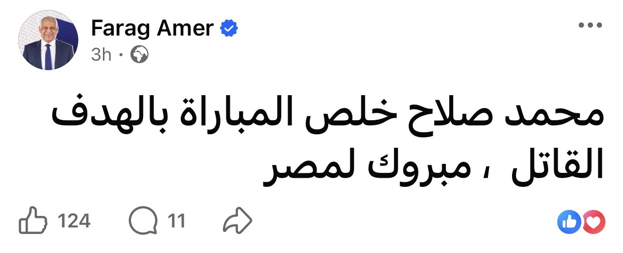 وكتب عامر عبر حسابه الشخصي بموقع فيسبوك: “محمد صلاح خلص المباراة بالهدف القاتل، مبروك لمصر”.