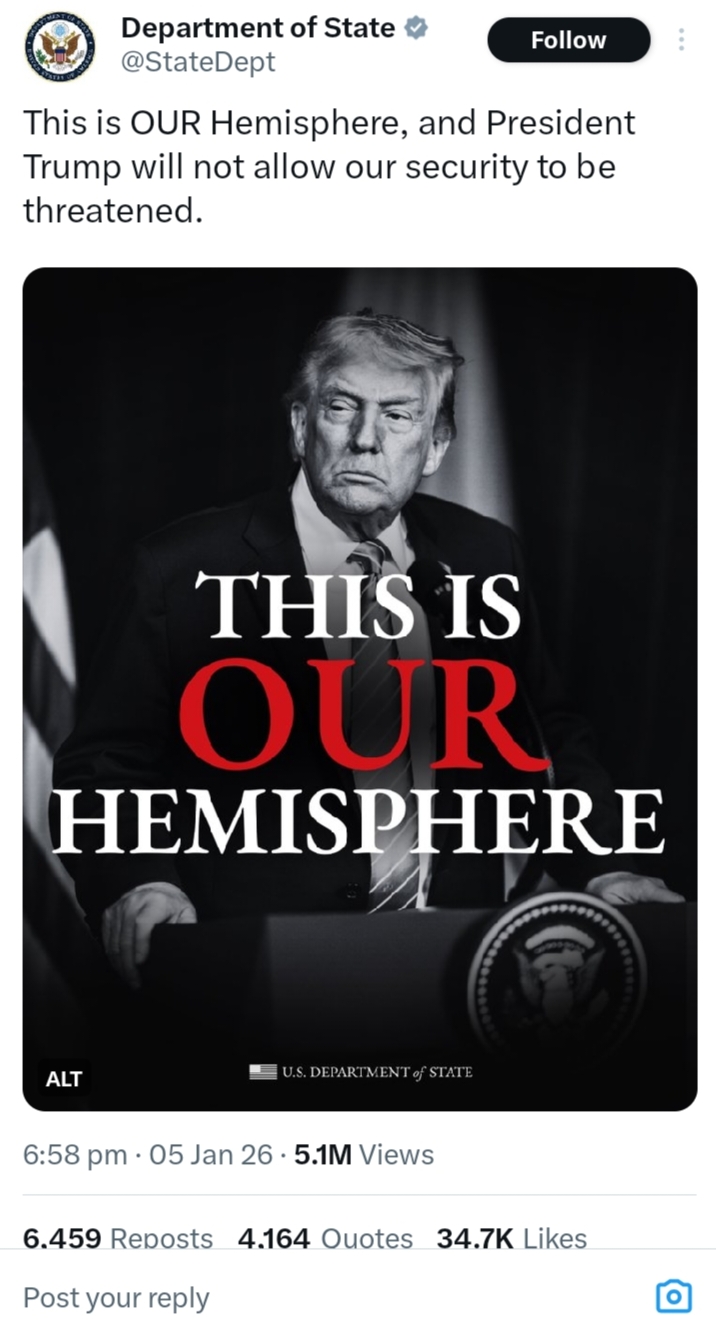 أعلنت وزارة الخارجية الأمريكية أن نصف الكرة الغربي يُعدّ "منطقة نفوذ خاصة بالولايات المتحدة"، وذلك بعد أيام من شن عملية عسكرية ضد فنزويلا واعتقال الرئيس نيكولاس مادورو وزوجته.