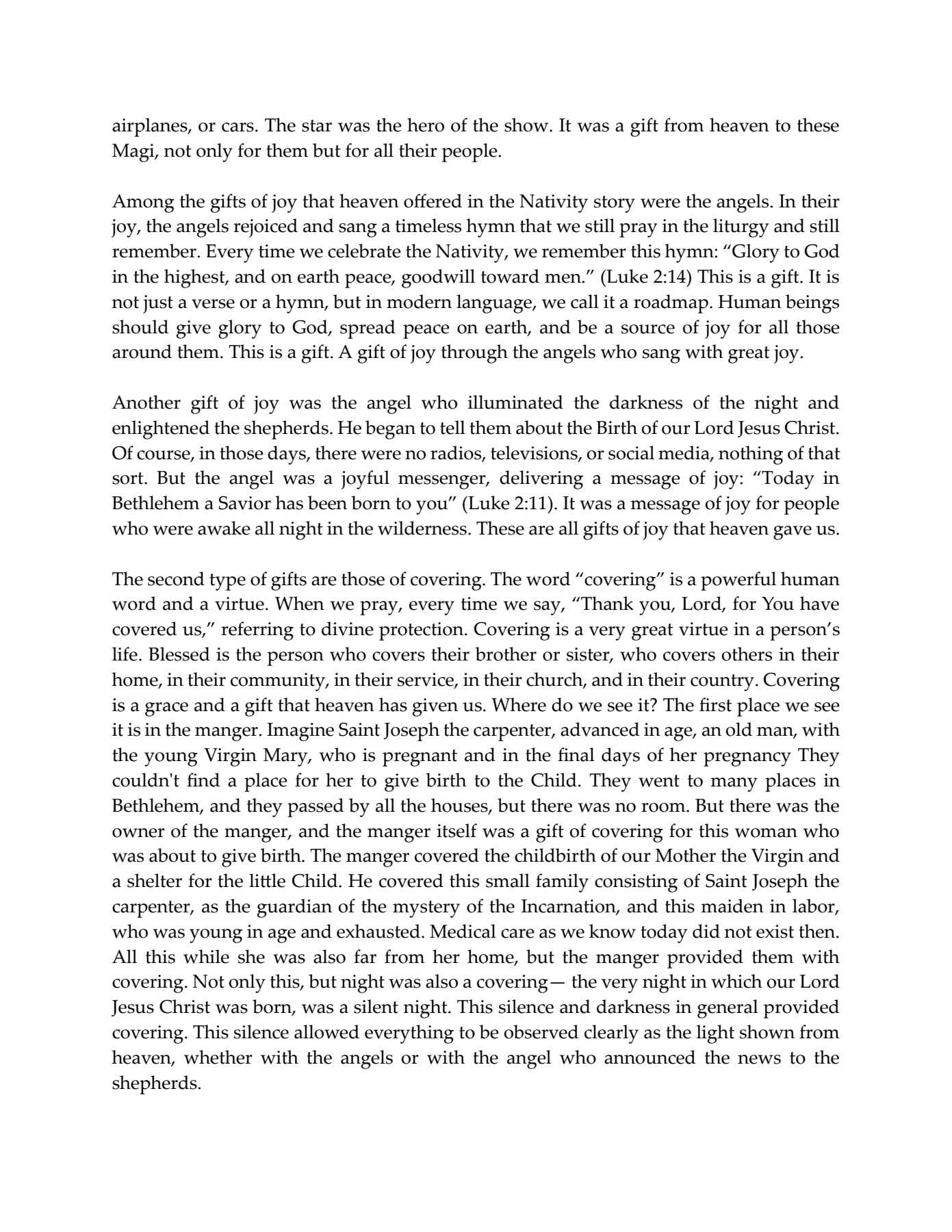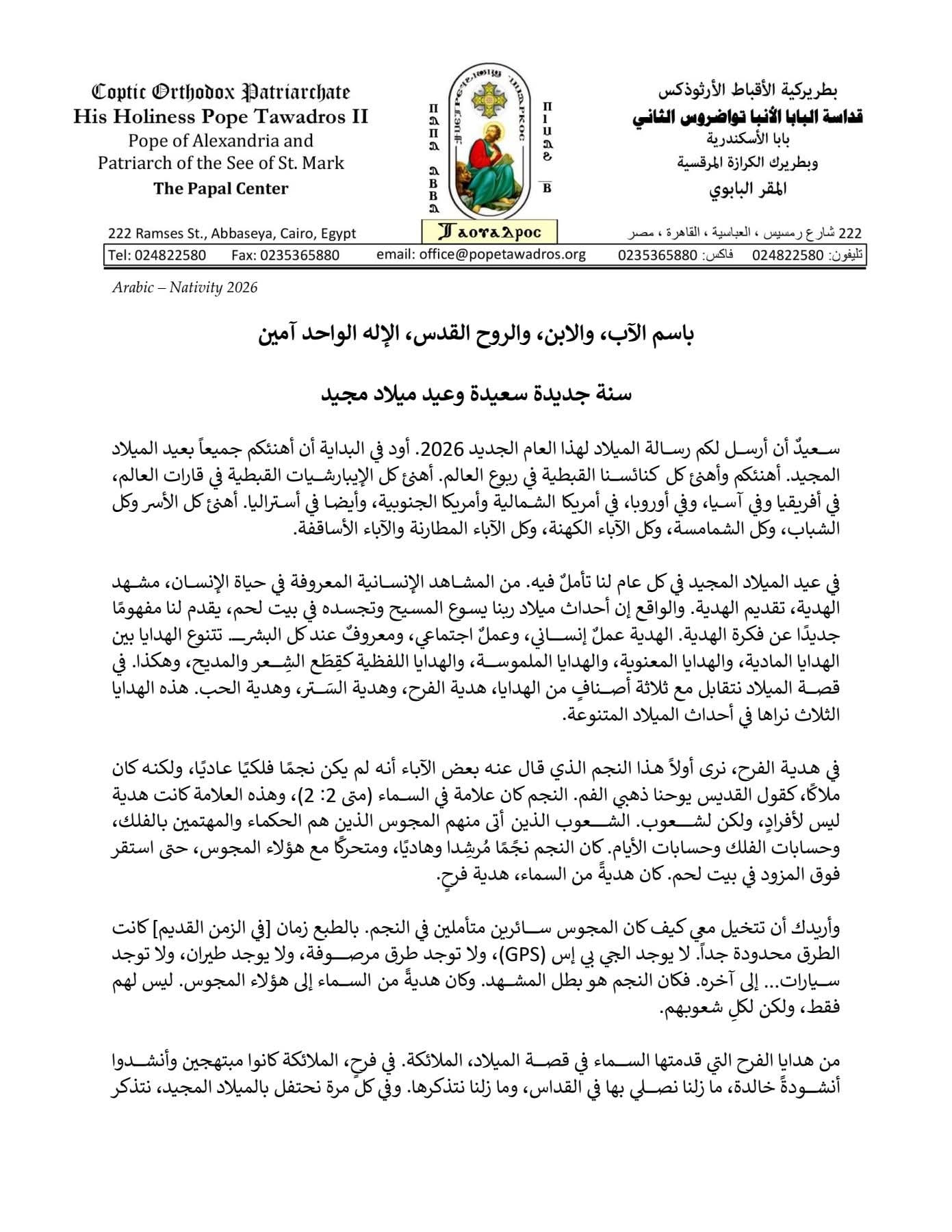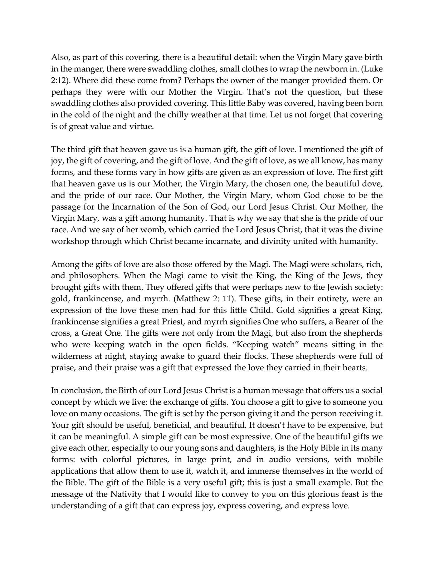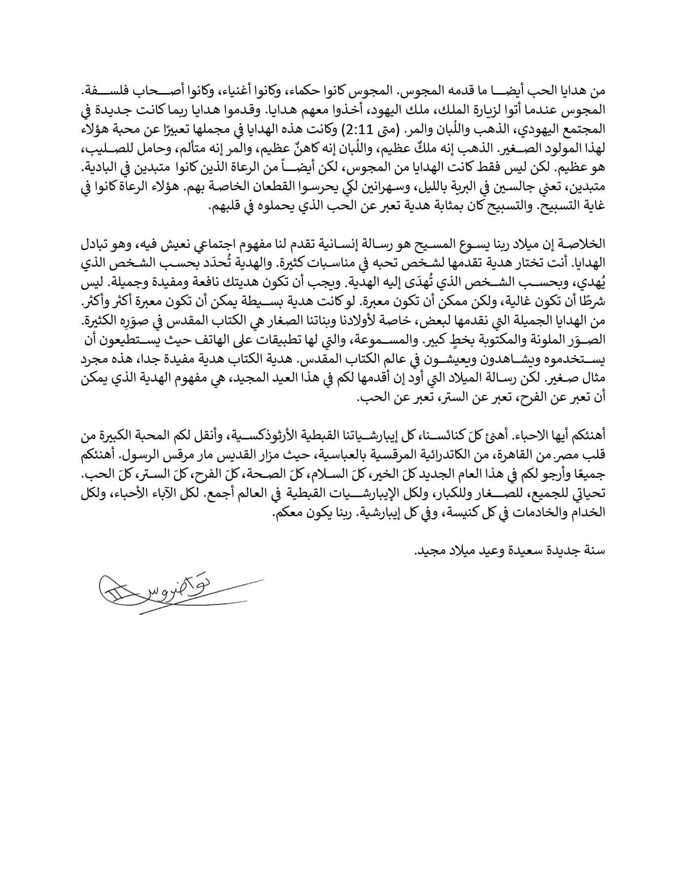 وتناول قداسة البابا في رسالته الرعوية ثلاث هدايا لميلاد السيد المسيح وهي: