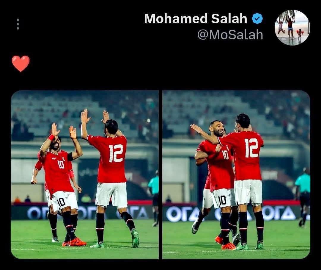 شارك محمد صلاح، نجم منتخب مصر، صورة مع اللاعب محمد حمدي، وذلك لإصابته بالرباط الصليبي أثناء مشاركته مع منتخب مصر في مواجهة بنين في دور الـ 16 من بطولة كأس الأمم الأفريقية، عبر حسابه على موقع “إكس”.