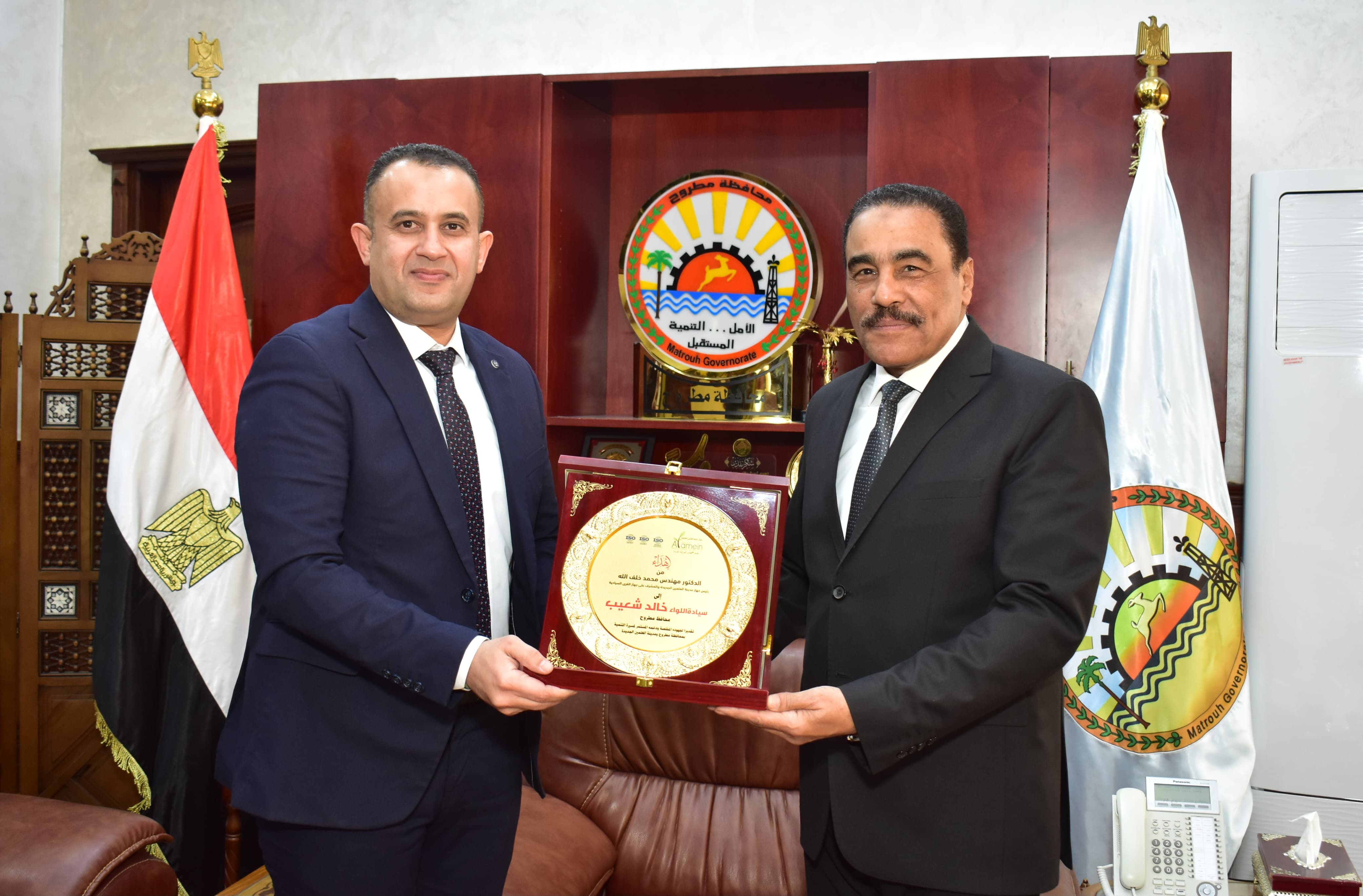 وفي نهاية اللقاء تم تبادل إهداء الدروع حيث اهدى اللواء خالد شعيب محافظ مطروح درع المحافظة الدكتور محمد خلف الله رئيس جهاز مدينه العلمين الجديدة ،واهدى رئيس جهاز مدينة العلمين الجديدة درع المدينة لمحافظ مطروح تقديرا واعتزازا لجهود التعاون والتنسيق المستمر مع مكانة المحافظة وجهاز مدينة العلمين الجديدة.