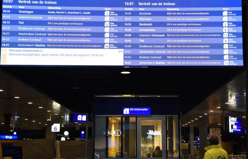 وفي منطقة أمستردام، وبسبب تجمد السكك الحديدية، تعمل القطارات بشروط مقيدة، ويعتمد استئناف الخدمة بالكامل على الأحوال الجوية.