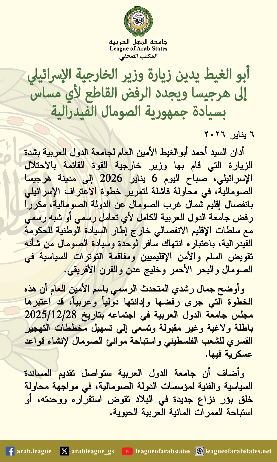 وأكد أبو الغيط أن جامعة الدول العربية تجدد رفضها الكامل لأي تعامل رسمي أو شبه رسمي مع سلطات الإقليم الانفصالي خارج إطار السيادة الوطنية للحكومة الفيدرالية الصومالية، مشددًا على أن هذه الخطوة تمثل انتهاكًا سافرًا لوحدة وسيادة الصومال، ومن شأنها تقويض السلم والأمن الإقليميين، ومفاقمة التوترات السياسية في الصومال والبحر الأحمر وخليج عدن والقرن الإفريقي.