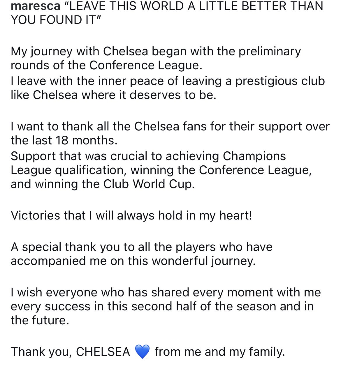 وعبر حسابه الرسمي على إنستجرام، وجه ماريسكا رسالة وداع مؤثرة، أكد خلالها شعوره بالرضا بعد نهاية تجربته مع البلوز، مشيرًا إلى أنه يغادر وهو يحمل سلامًا داخليًا بعد العمل داخل نادٍ كبير بحجم تشيلسي.
