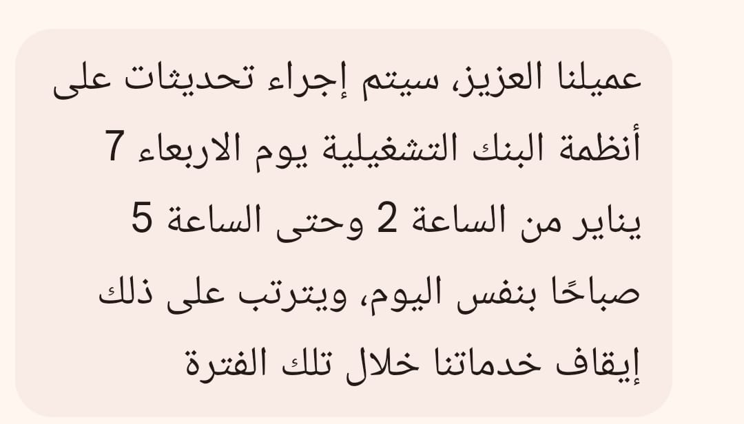 اعلن البنك الاهلي المصري عن ايقاف بعد الخدمات المصرفية غدا الأربعاء ٧ يناير 2026 لمدة 3 ساعات من فجر ذلك اليوم .