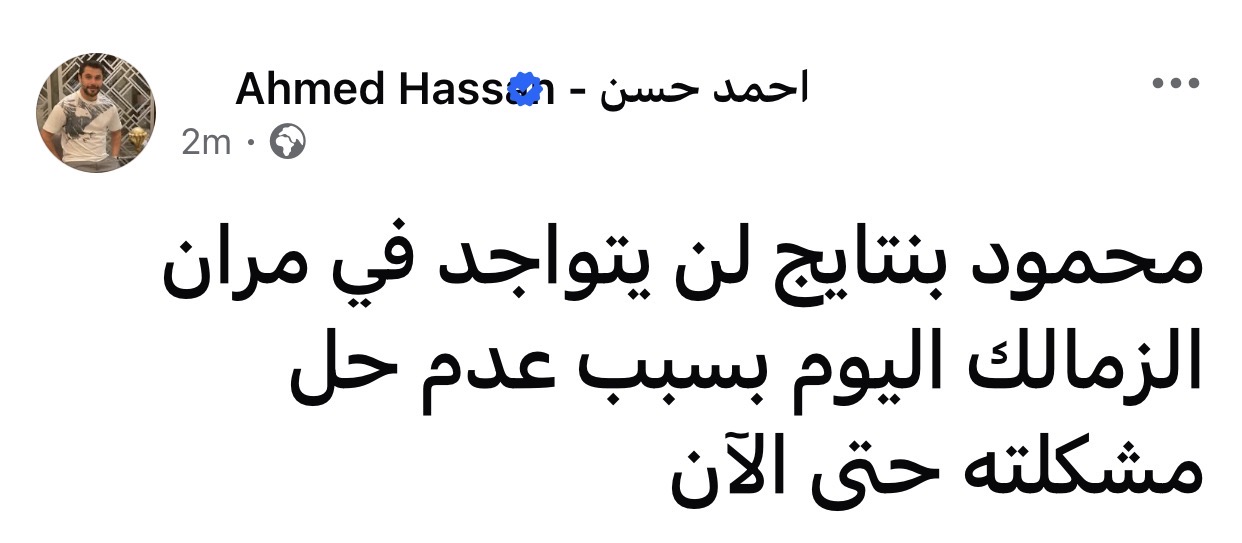 وكتب أحمد حسن عبر حسابه الشخصي بموقع فيسبوك: “محمود بنتايج لن يتواجد في مران الزمالك اليوم بسبب عدم حل مشكلته حتى الآن”.