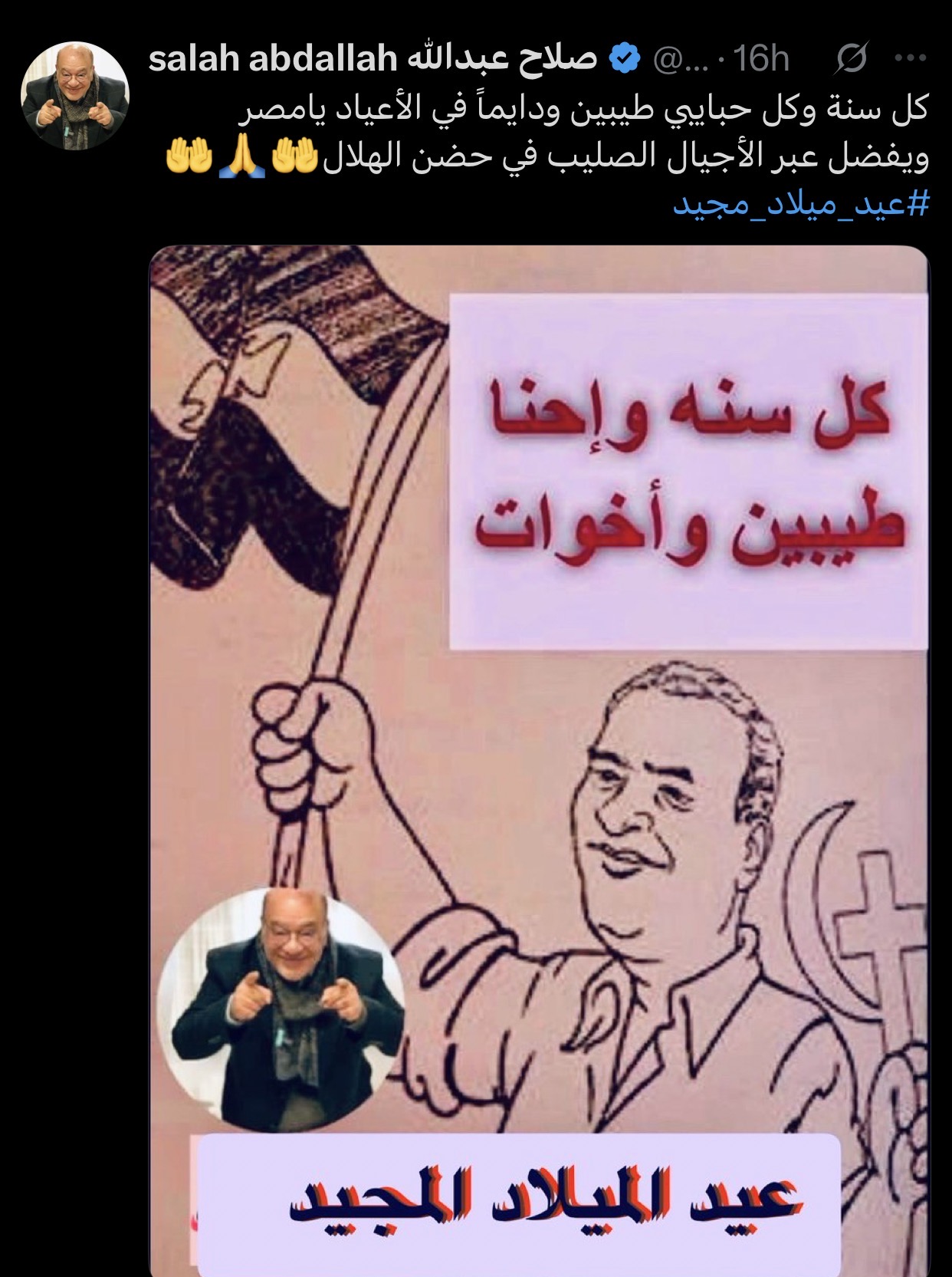 وكتب صلاح عبدالله عبر حسابه الشخصي على منصة إكس: “كل سنة وكل حبايي طيبين ودايماً في الأعياد يا مصر ويفضل عبر الأجيال الصليب في حضن الهلال”.