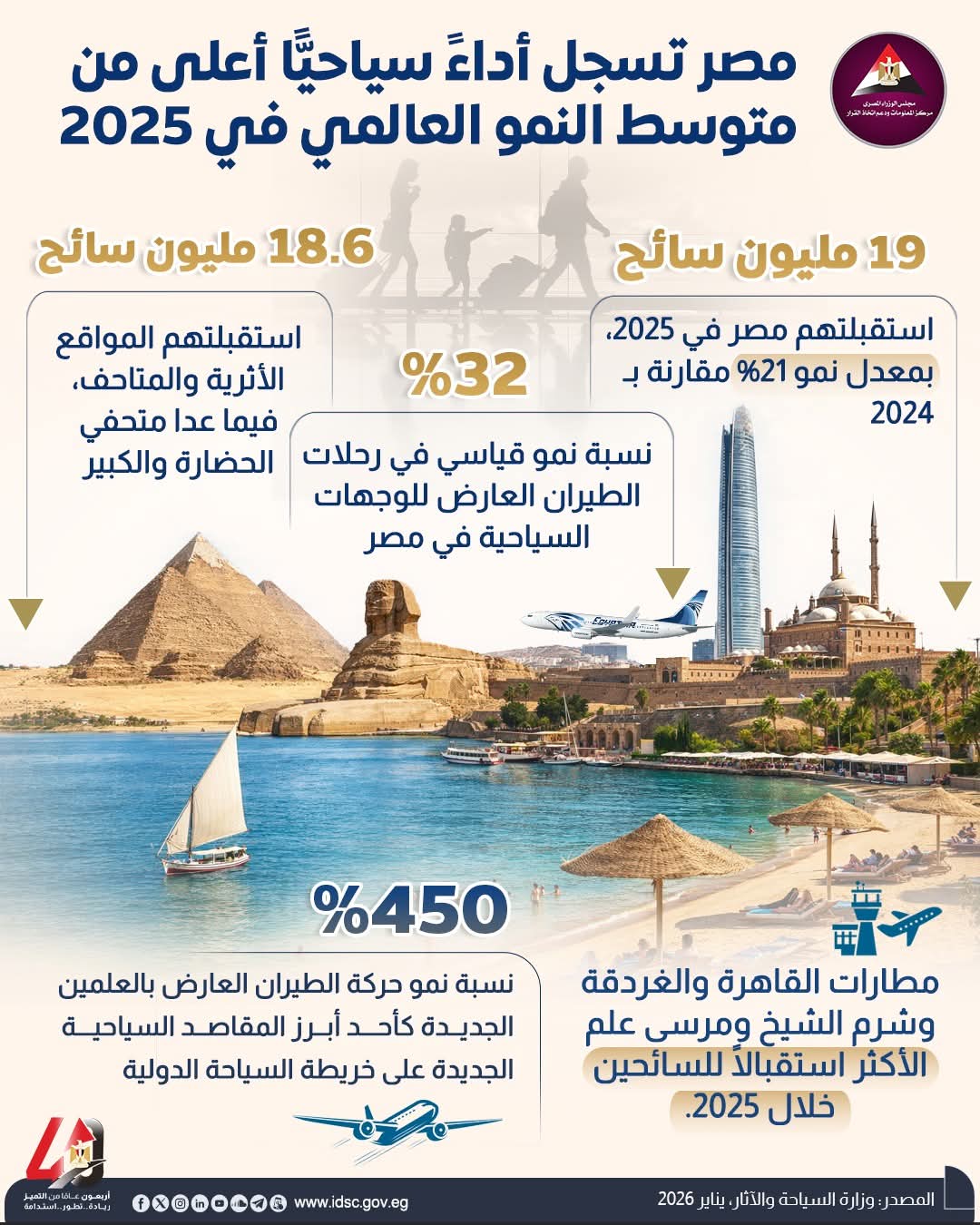 وأوضح المركز ان السياحة المصرية سجلت خلال عام 2025 أداءً استثنائيًّا وغير مسبوق، حيث استقبلت مصر نحو 19 مليون سائح، محققة رقمًا قياسيًّا جديدًا بمعدل نمو بلغ 21%، مقارنة بعام 2024، في إنجاز يعكس القوة المتنامية للمقصد السياحي المصري على الساحة الدولية.