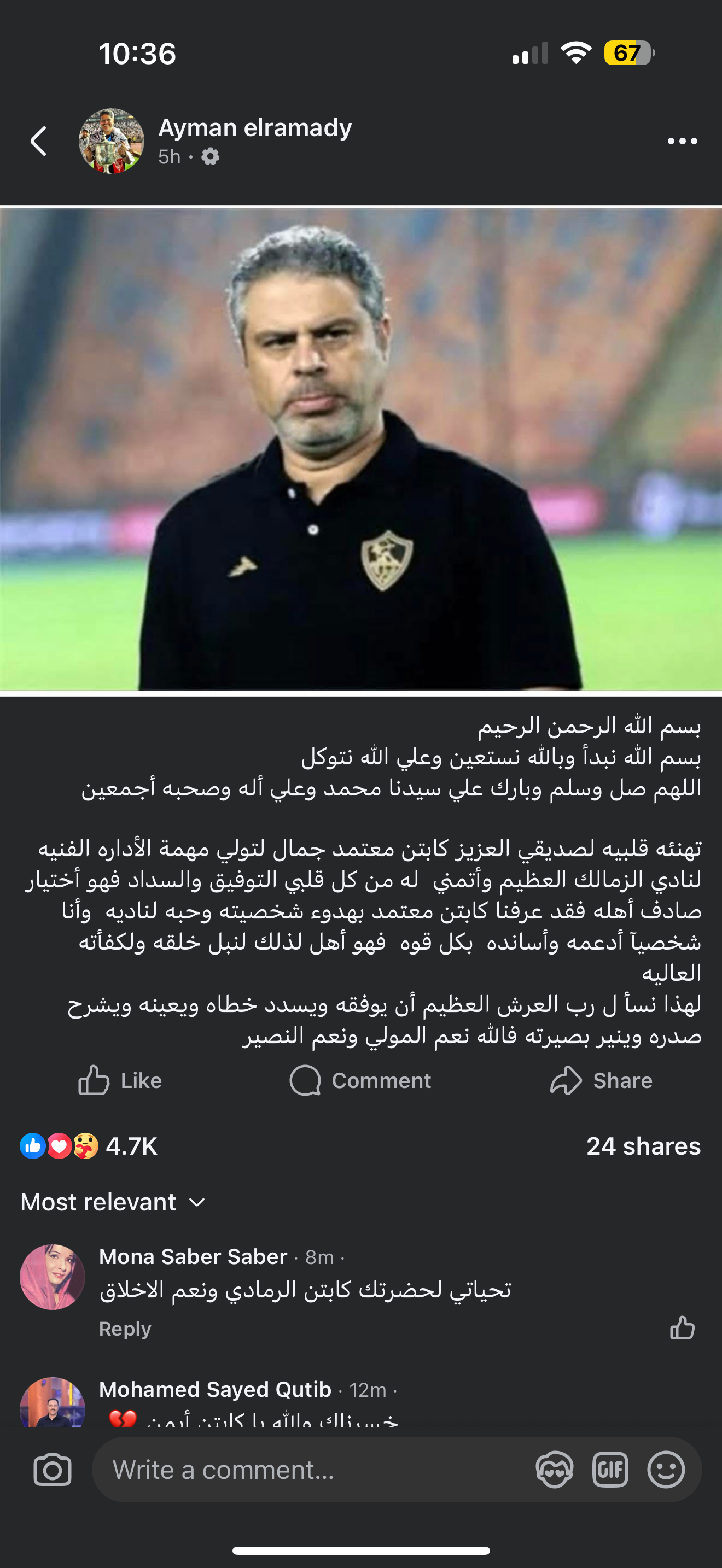 وكتب أيمن الرمادي عبر حسابه الشخصي على فيس بوك: بسم الله الرحمن الرحيم، بسم الله نبدأ وبالله نستعين وعلى الله نتوكل، اللهم صل وسلم وبارك على سيدنا محمد وعلى آله وصحبه أجمعين، تهنئة قلبية لصديقي العزيز كابتن معتمد جمال لتولي مهمة الإدارة الفنية لنادي الزمالك العظيم وأتمني له من كل قلبي التوفيق والسداد، فهو اختيار صادف أهله، فقد عرفنا كابتن معتمد بهدوء شخصيته وحبه لناديه، وأنا شخصيا أدعمه وأسانده بكل قوة فهو أهل لذلك لنبل خلقه ولكفاءته العالية.. لهذا نسأل رب العرش العظيم أن يوفقه ويسدد خطاه ويعينه فهو نعم المولي ونعم النصير.