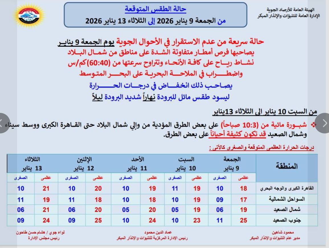 وحذّرت الهيئة العامة للأرصاد الجوية من حالة سريعة من عدم الاستقرار في الأحوال الجوية تبدأ يوم الجمعة 9 يناير 2026 وتستمر حتى الثلاثاء 13 يناير، يصاحبها سقوط أمطار متفاوتة الشدة على مناطق من شمال البلاد، إلى جانب نشاط ملحوظ للرياح على أغلب الأنحاء.