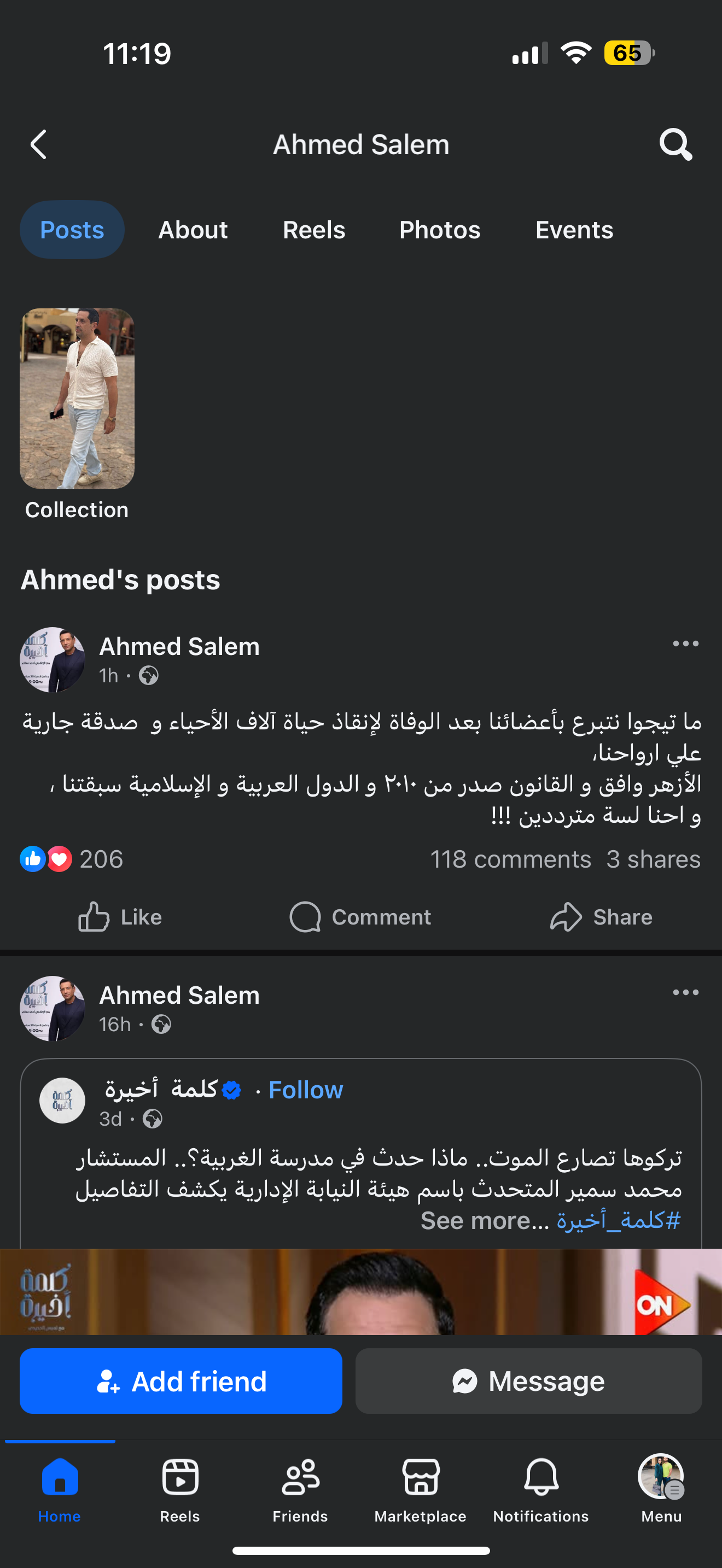 وكتب أحمد سالم عبر حسابه على موقع التواصل الاجتماعي فيسبوك: ما تيجوا نتبرع بأعضائنا بعد الوفاة لإنقاذ حياة آلاف الأحياء وصدقة جارية على أرواحنا.. الأزهر وافق والقانون صدر من 2010 والدول العربية والإسلامية سبقتنا واحنا لسه مترددين.