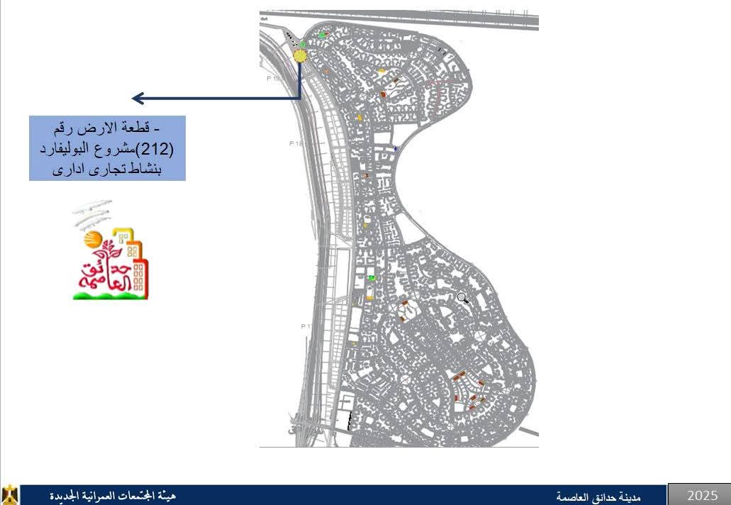 ▪️قطعة أرض رقم (٢١٢) – بمنطقة البوليفارد – بمساحة (٦٤٤) م² – نشاط (تجاري إداري).