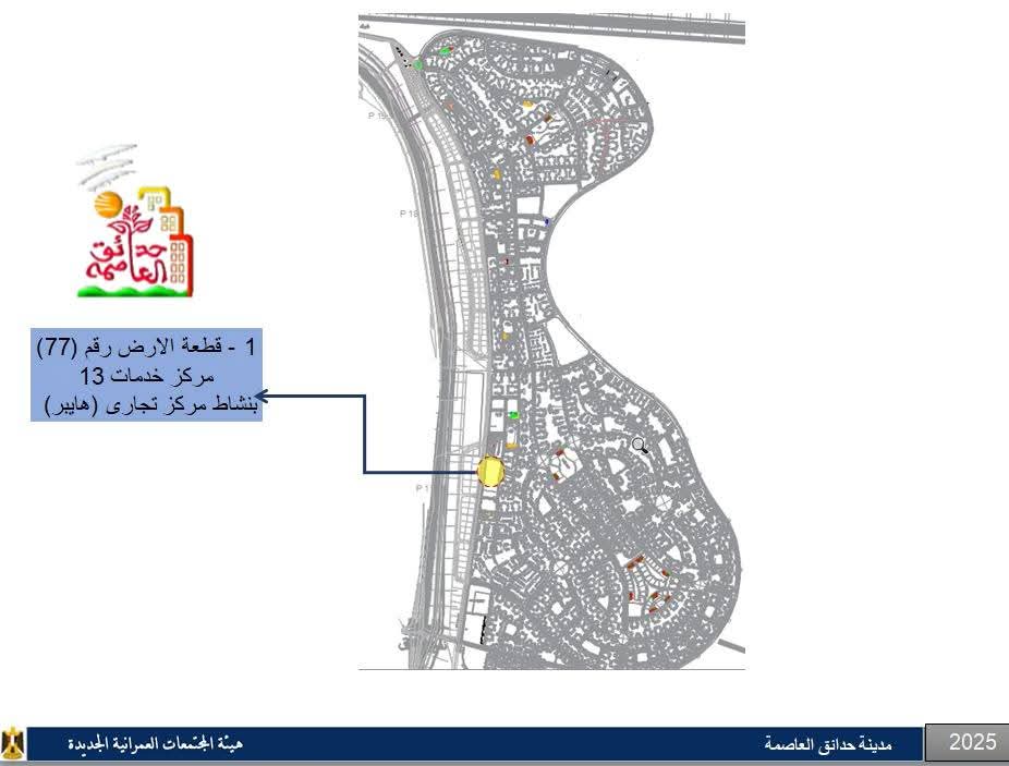 ▪️قطعة أرض رقم (٧٧) – بمركز خدمات رقم (١٣) بمنطقة الإسكان الاجتماعي بمنطقة ٢٣٥٠ فدان - بمساحة (٣٩٥٠٦) م² – نشاط ( مركز تجاري "هايبر").