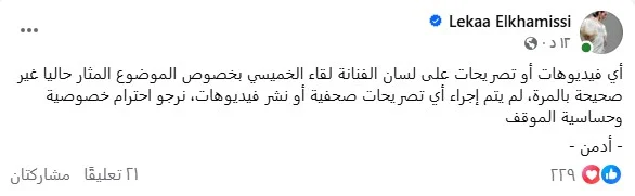 وكتبت صفحة لقاء الخميسي عبر "فيس بوك": "أي فيديوهات أو تصريحات على لسان الفنانة لقاء الخميسي بخصوص الموضوع المثار حاليا غير صحيحة بالمرة، لم يتم إجراء أي تصريحات صحفية أو نشر فيديوهات، نرجو احترام خصوصية وحساسية الموقف.. الأدمن".