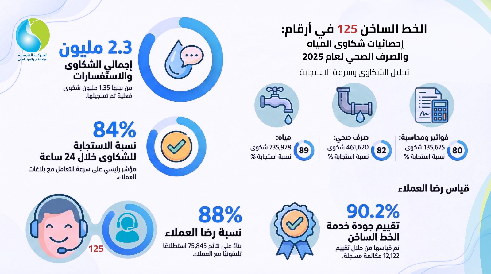 وسجلت شكاوى مياه الشرب نحو 735,978 شكوى، بنسبة استجابة بلغت 82%، في إطار الالتزام بزمن الاستجابة المستهدف. كما بلغ عدد شكاوى الصرف الصحي نحو 461,620 شكوى، بنسبة استجابة مرتفعة وصلت إلى 89%، في حين تم التعامل مع 135,675 شكوى متعلقة بالمحاسبة والفواتير بنسبة استجابة بلغت 80%.