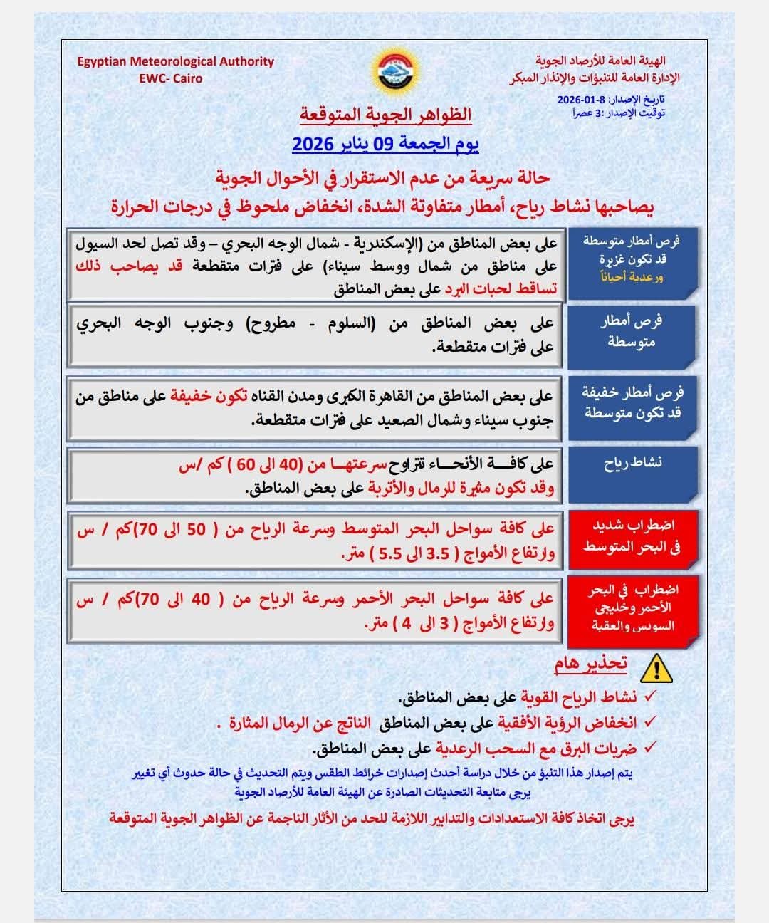 وحذرت هيئة الأرصاد الجوية من اضطراب الملاحة البحرية على كافة سواحل البحر المتوسط اعتبارا من الساعة الثانية صباحاً يوم الجمعة ٩ يناير حتى الساعة العاشرة صباحا ً من يوم السبت ١٠ يناير