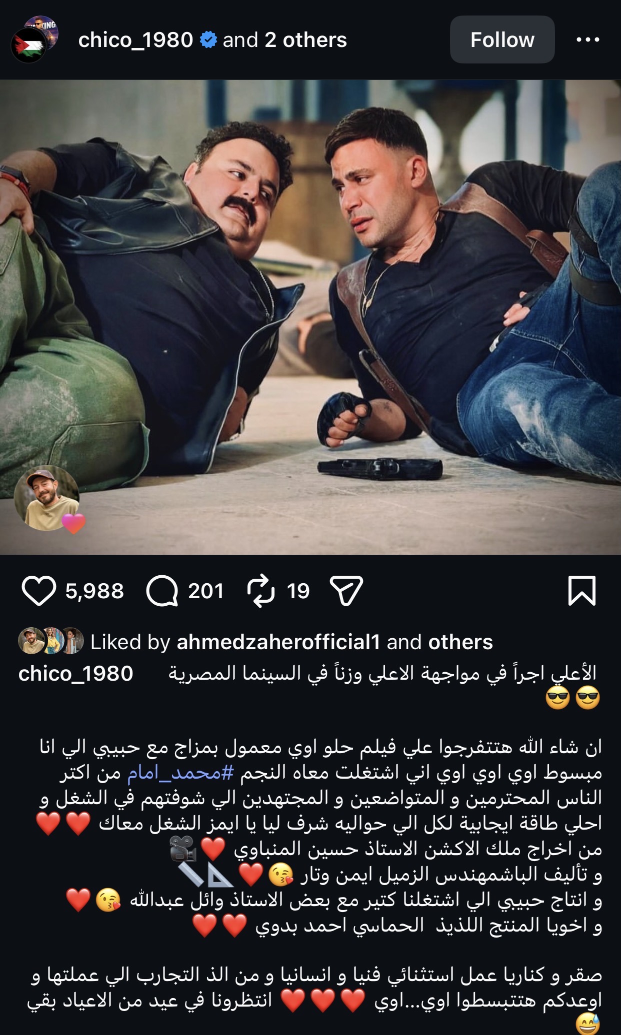 حيث نشر شيكو صورة تجمعه بالفنان محمد إمام من كواليس التصوير على حسابه الشخصي بموقع إنستجرام وعلق عليها قائلاً: “الأعلي اجراً في مواجهة الاعلي وزناً في السينما المصرية، ان شاء اللّٰه هتتفرجوا علي فيلم حلو اوي معمول بمزاج مع حبيبي الي انا مبسوط اوي اوي اوي اني اشتغلت معاه”.