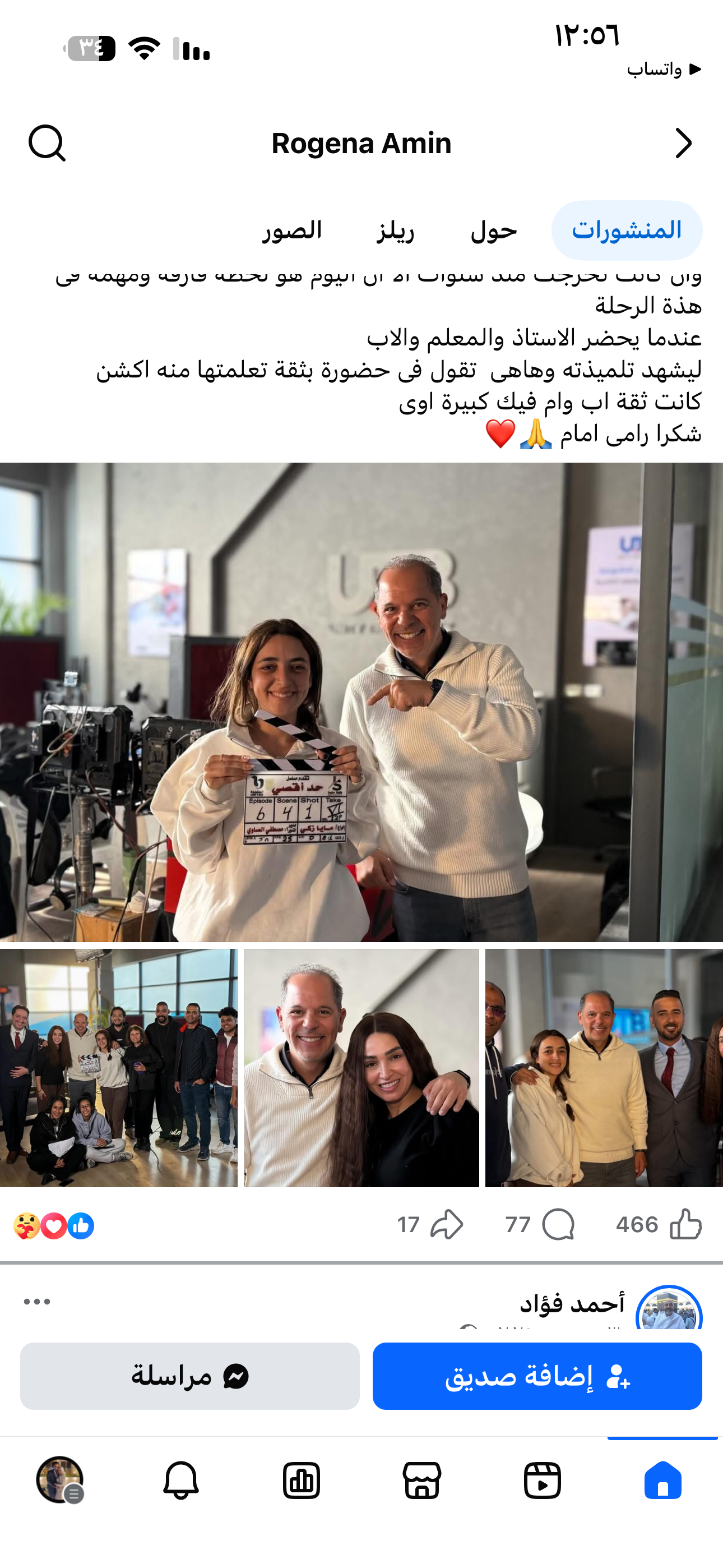 وأضافت مايا اشرف زكي أن حضور رامي إمام إلى لوكيشن التصوير اليوم يحمل معنى خاصًا، خاصة بعد سنوات من التخرج، ليشاهد تلميذته وهي تقف بثقة داخل موقع التصوير، مؤكدة أن هذه الثقة تعلمتها منه، واصفة إياه بـ«الأستاذ والمعلم والأب»، وموجهة له الشكر والتقدير على دعمه الكبير لها.