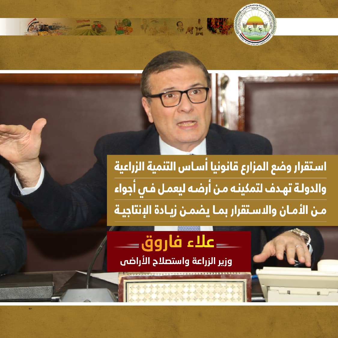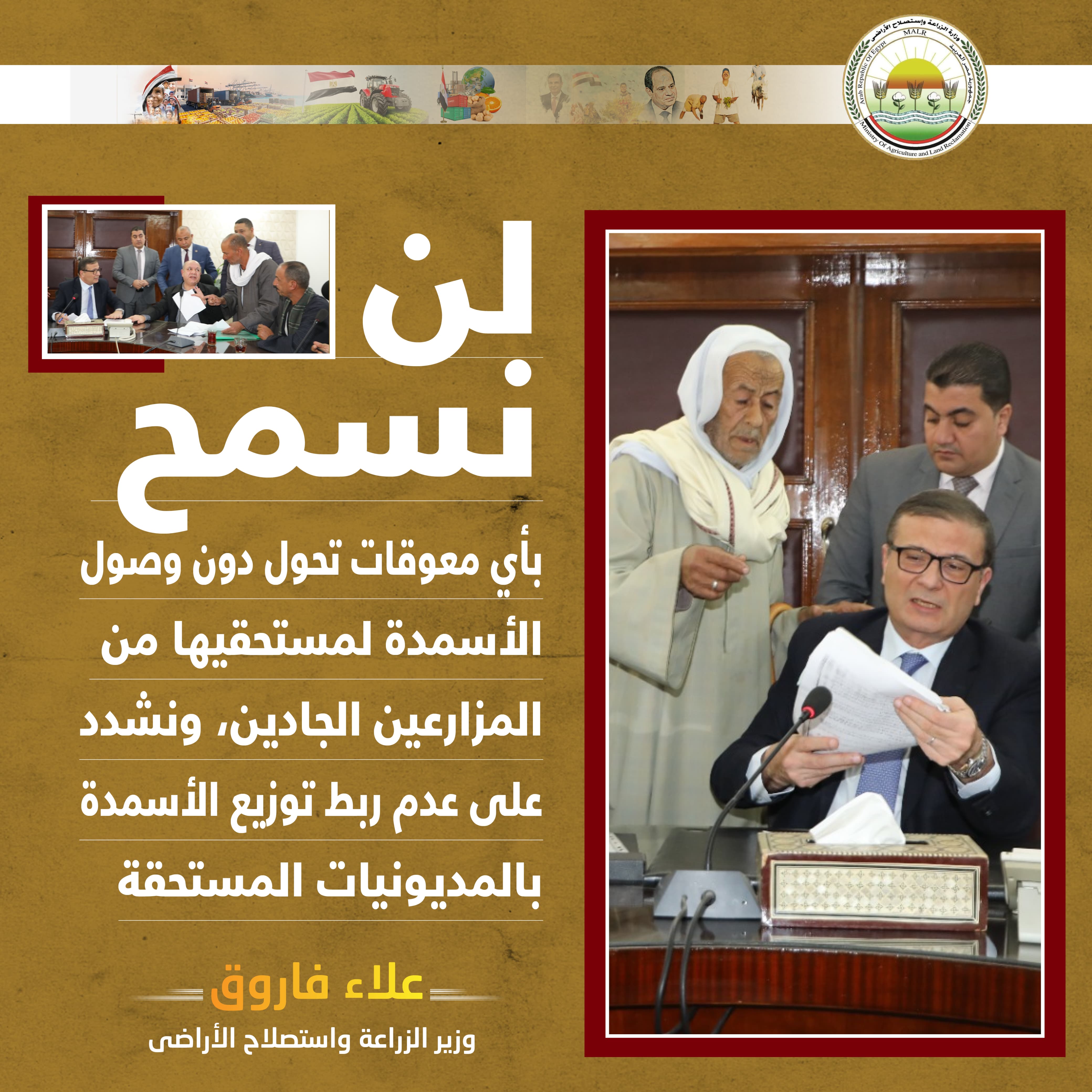 خلال اللقاء، وجه وزير الزراعة الهيئة العامة للإصلاح الزراعي، بضرورة صرف كافة الكميات المستحقة والمتبقية من الأسمدة للمنتفعين بشكل فوري، مؤكداً أن الوزارة لن تسمح بأي معوقات تحول دون وصول الأسمدة لمستحقيها من المزارعين الجادين، كما شدد على عدم ربط توزيع الأسمدة بالمديونيات المستحقة، وأن يتم صرف الأسمدة للمنتفعين دون ربطها بأي مديونيات.