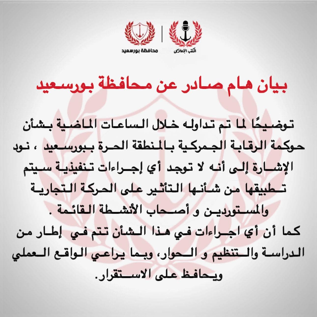 وأكدت محافظة بورسعيد والغرفة التجارية على صفحاتها الرسمية بواقع التواصل في بيان هام صادر توضيحًا لما تم تداوله خلال الساعات الماضية بشأن حوكمة الرقابة الجمركية بالمنطقة الحرة ببورسعيد ، نود الإشارة إلى أنه لا توجد أي إجراءات تنفيذية سيتم تطبيقها من شأنها التأثير على الحركة التجارية والمستوردين وأصحاب الأنشطة القائمة.