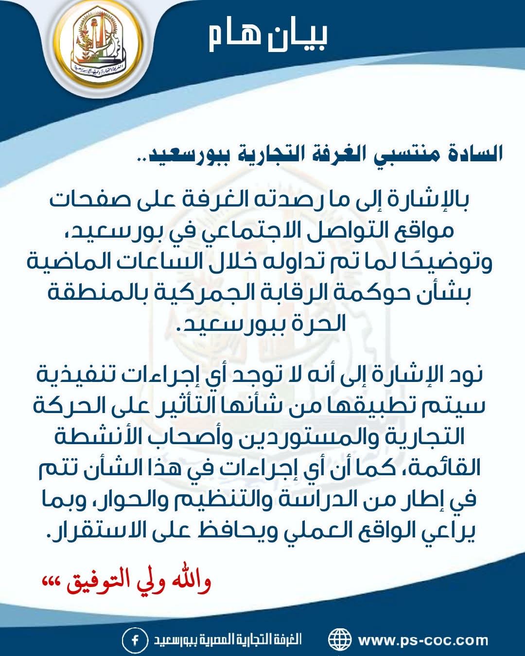 نفت محافظة بورسعيد و الغرفة التجارية بالمحافظة على صفحاتها بمواقع التواصل الاجتماعي تنفيذ منشور متداول على صفحات التواصل الاجتماعي يفرض قيود كبيرة على المنطقة الحرة.