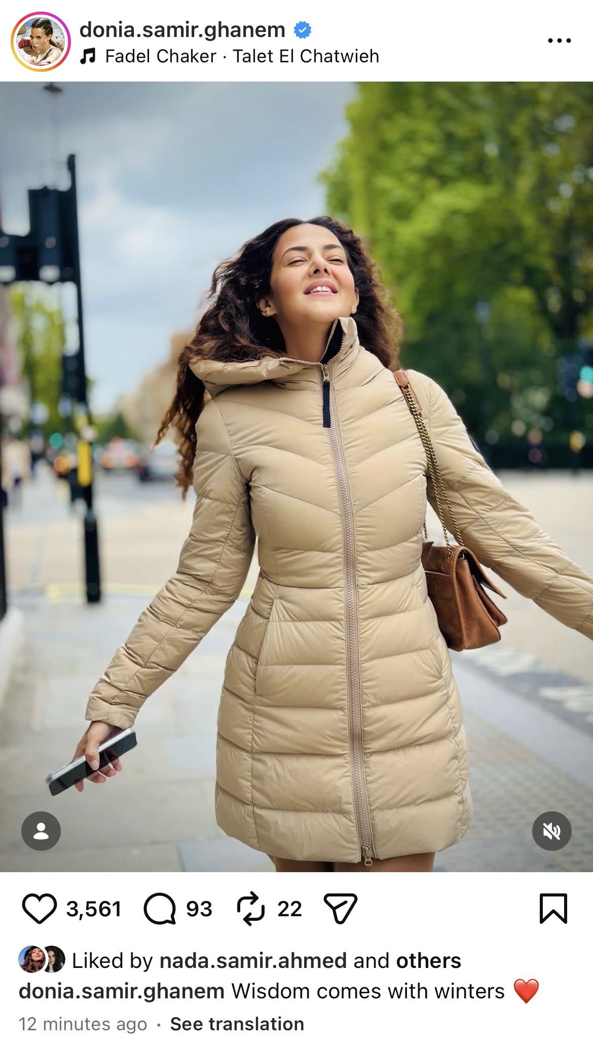 وظهرت دنيا سمير غانم بإطلالة شتوية، وكتبت: “الحكمة تأتي مع الشتاء”.