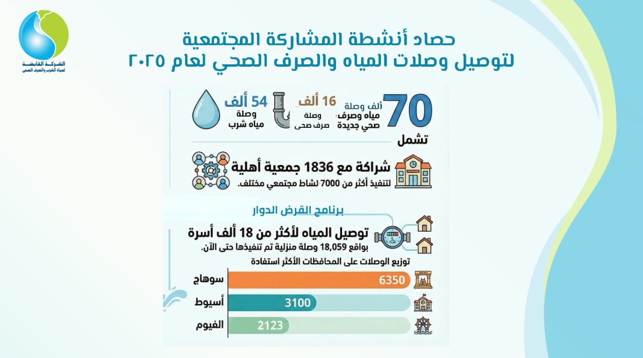 واصلت الشركة القابضة لمياه الشرب والصرف الصحي خلال عام 2025 تعزيز دور المشاركة المجتمعية، باعتبارها أحد المحاور الأساسية لدعم الفئات الأولى بالرعاية، وتحسين مستوى الخدمات، وتوسيع نطاق الاستفادة من مشروعات مياه الشرب والصرف الصحي في مختلف المحافظات.