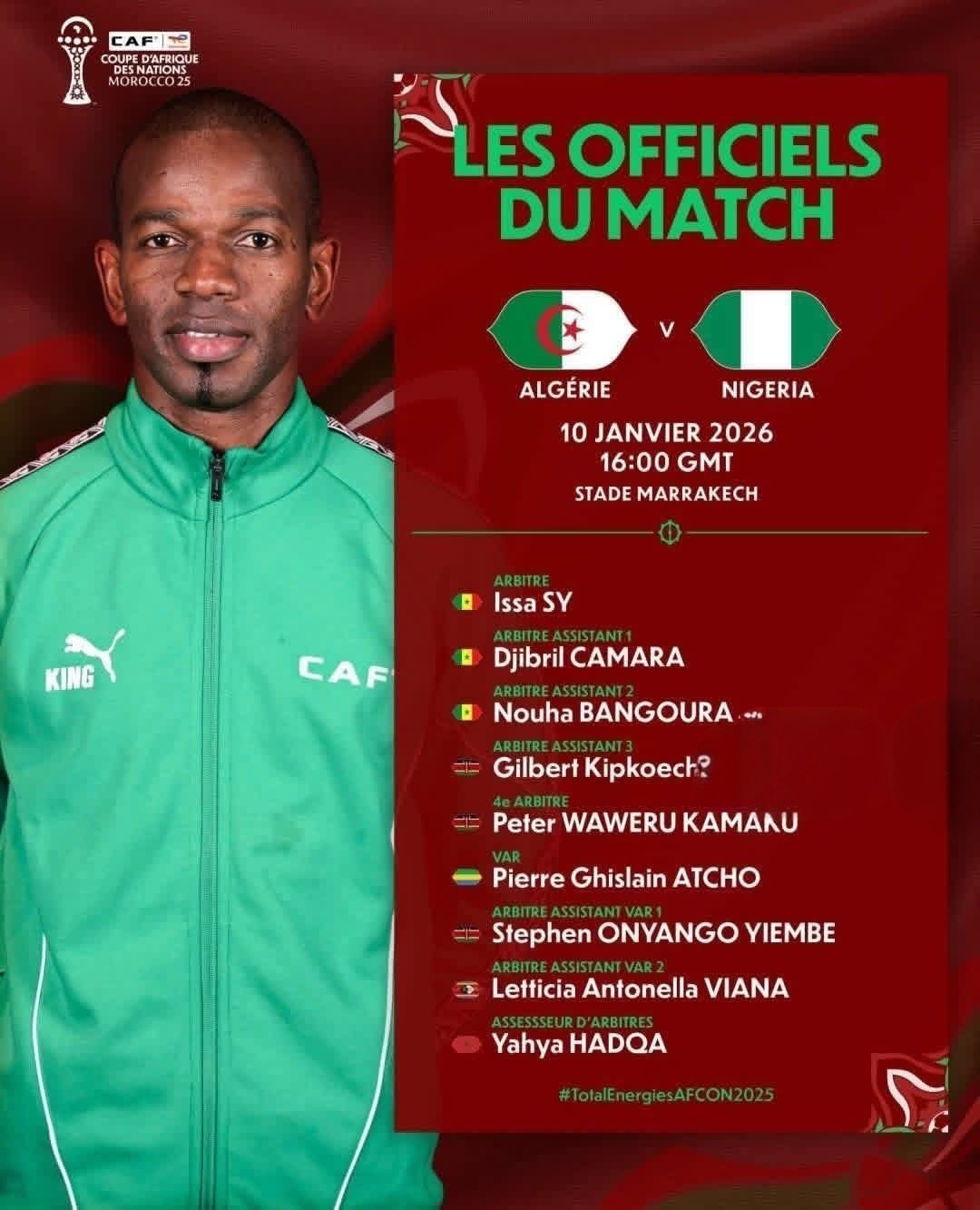أعلن الاتحاد الإفريقي لكرة القدم «كاف» تعيين طاقم تحكيم مباراة الجزائر ونيجيريا، ضمن منافسات الدور ربع النهائي لبطولة كأس الأمم الإفريقية، والمقرر إقامتها يوم السبت 10 يناير 2026، على ملعب مراكش الكبير بالمغرب.
