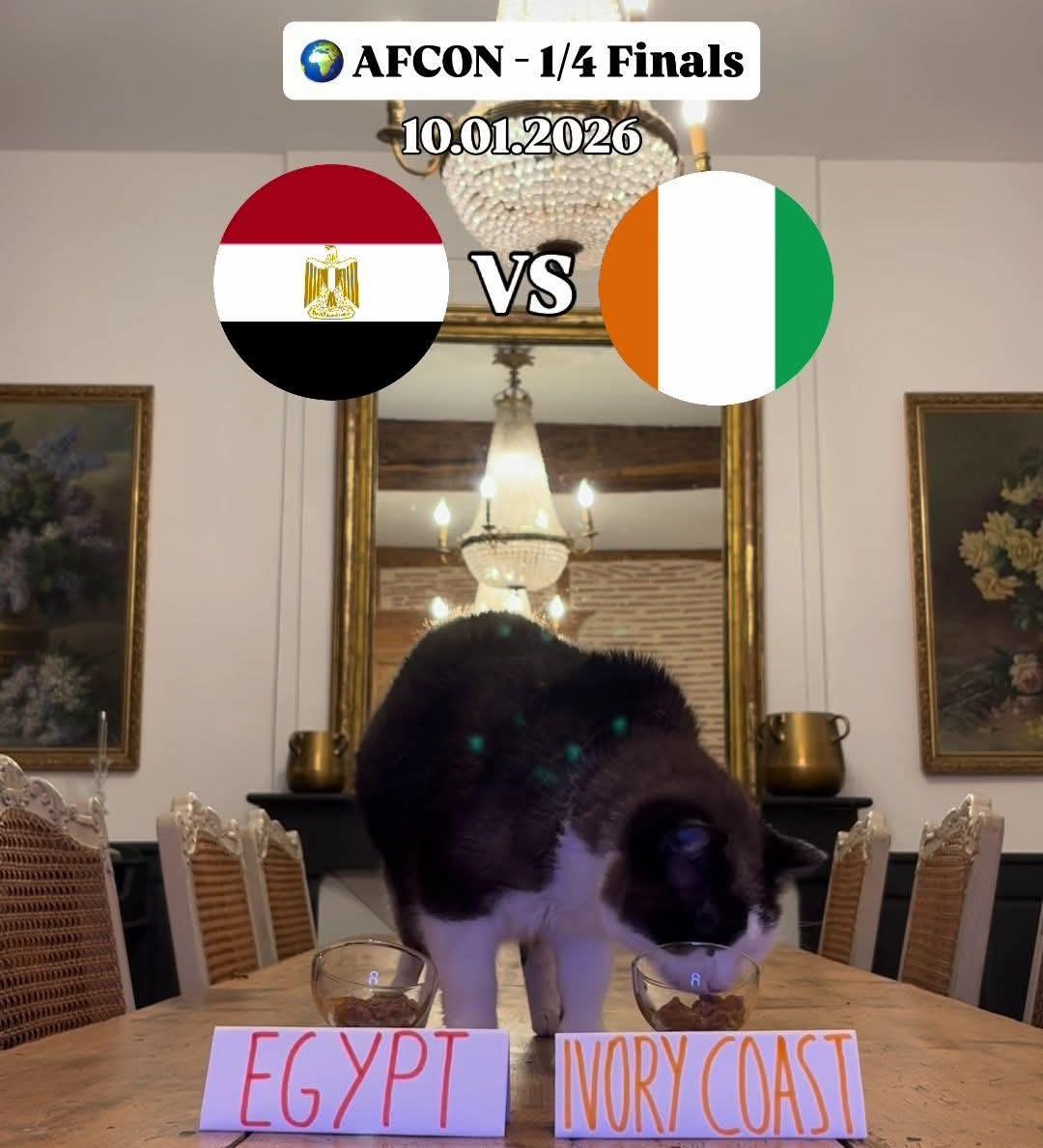 وظهر القط نيمبوس في الصورة وأمامه وعاءان يحملان اسمي المنتخبين، حيث اتجه لاختيار وعاء «Ivory Coast»، في إشارة رمزية لتوقعه فوز منتخب الأفيال على الفراعنة، في المباراة المقرر إقامتها يوم 10 يناير 2026، ضمن منافسات الدور الإقصائي للبطولة.