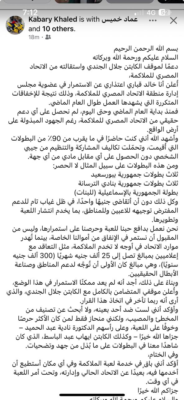 وجاء نص استقالة خالد عبدالجابر أمين صندوق منطقة أسيوط للملاكمة على النحو التالي: