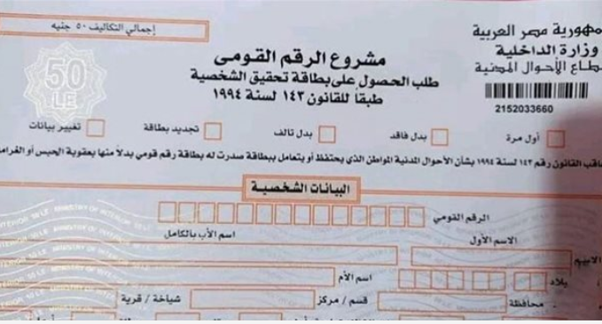 ـ تعبئة البيانات المطلوبة بدقة مثل الاسم، الرقم القومي، محل الإقامة، المهنة، وجهة العمل.