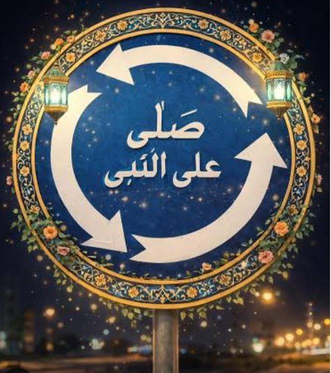 ـ النص: في المركز، كتابة عبارة "صلي على النبي" بخط عربي بسيط يشبه خطوط إشارات المرور، أبيض، متوازن، واضح، وروحي.