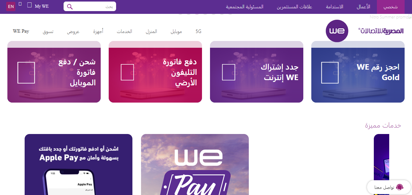ـ موقع المصرية للاتصالات عن طريق بطاقة الائتمان.