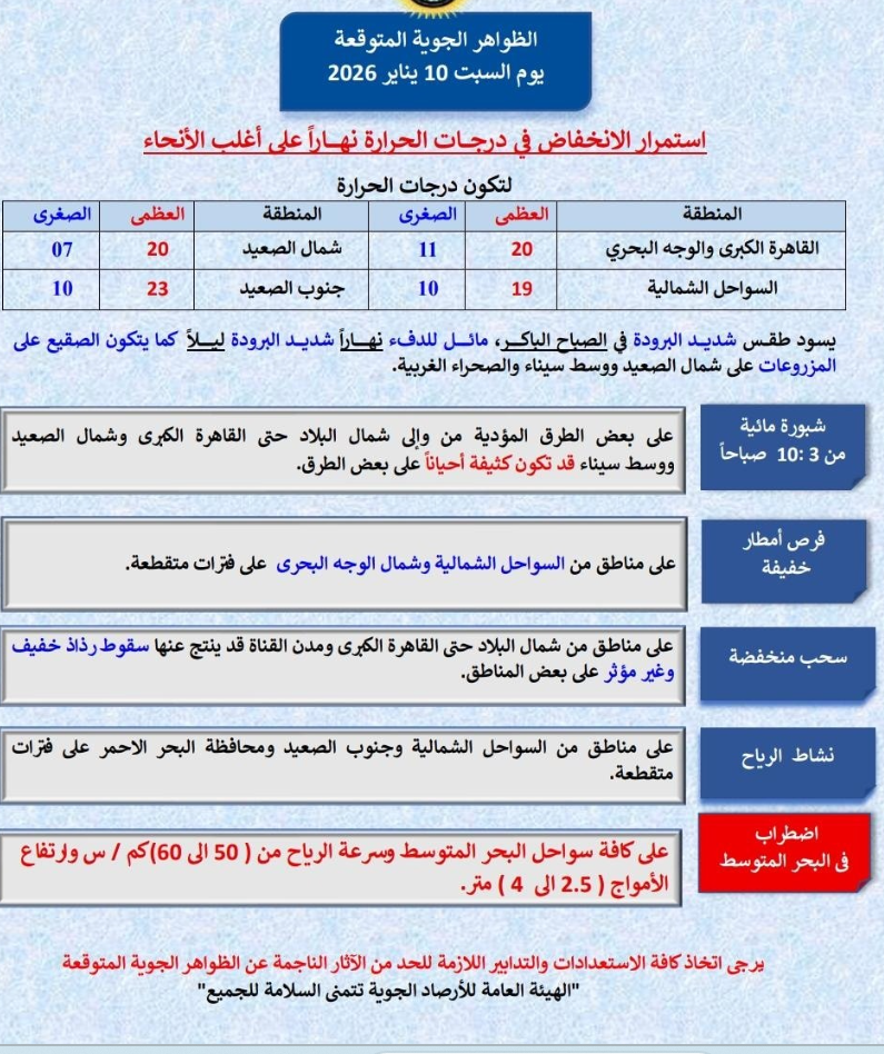 كما حذّرت هيئة الأرصاد الجوية، من تكوّن شبورة مائية كثيفة أحيانًا خلال ساعات الصباح على بعض الطرق المؤدية من وإلى شمال البلاد، مرورًا بالقاهرة الكبرى وشمال الصعيد ووسط سيناء، وهو ما قد يؤثر على مستوى الرؤية الأفقية.