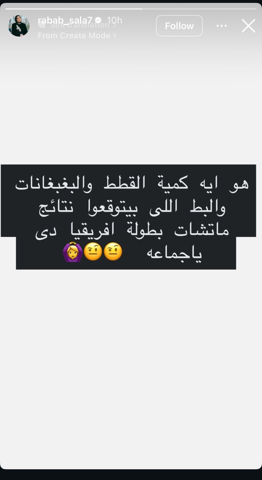 وكتبت رباب، عبر حسابها على “إنستجرام”: “هو إيه كمية القطط والبغبغانات والبط اللي بيتوقعوا نتائج ماتشات بطولة أفريقيا دي يا جماعة”.