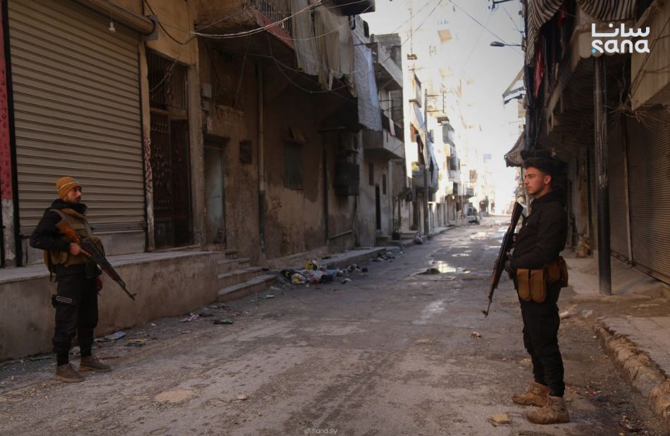 نشرت وكالة الأنباء السورية الرسمية "سانا" صورا لانتشار قوى الأمن الداخلي بحي الشيخ مقصود في حلب لتأمين المنطقة وحماية المواطنين والممتلكات العامة والخاصة.