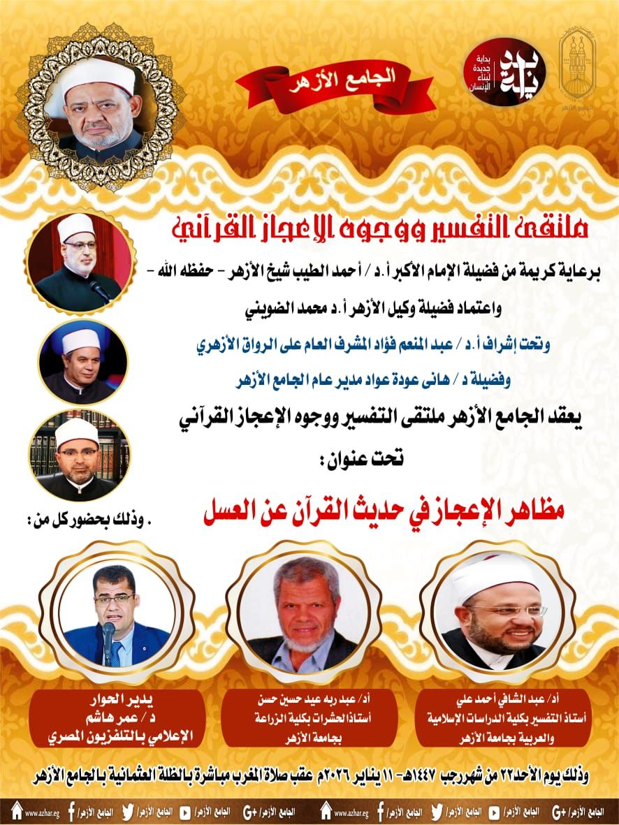 برعاية كريمة من الإمام الأكبر أ.د أحمد الطيب، شيخ الأزهر الشريف، وبتوجيهات أ.د محمد الضويني، وكيل الأزهر، يواصل ملتقى التفسير بالجامع الأزهر اليوم لقاء التفسير الأسبوعي بعنوان "وجوه الإعجاز في حديث القرآن عن العسل" وذلك بحضور كل من: أ.د عبد الشافي الشيخ، أستاذ التفسير بكلية الدراسات الإسلامية والعربية جامعة الأزهر، وأ.د عبد ربه عيد حسين حسن، أستاذ علم الحشرات بكلية العلوم جامعة الأزهر، ويدير الحوار د. عمر هاشم الإعلامي بالتليفزيون المصري.