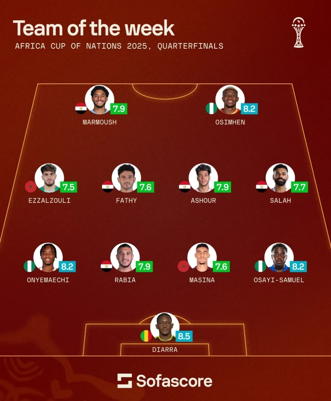 وتواجد 4 لاعبين من منتخب مصر في تشكيل الأفضل في ربع نهائي أمم أفريقيا وهم رامي ربيعة وإمام عاشور وحمدي فتحي وعمر مرموش