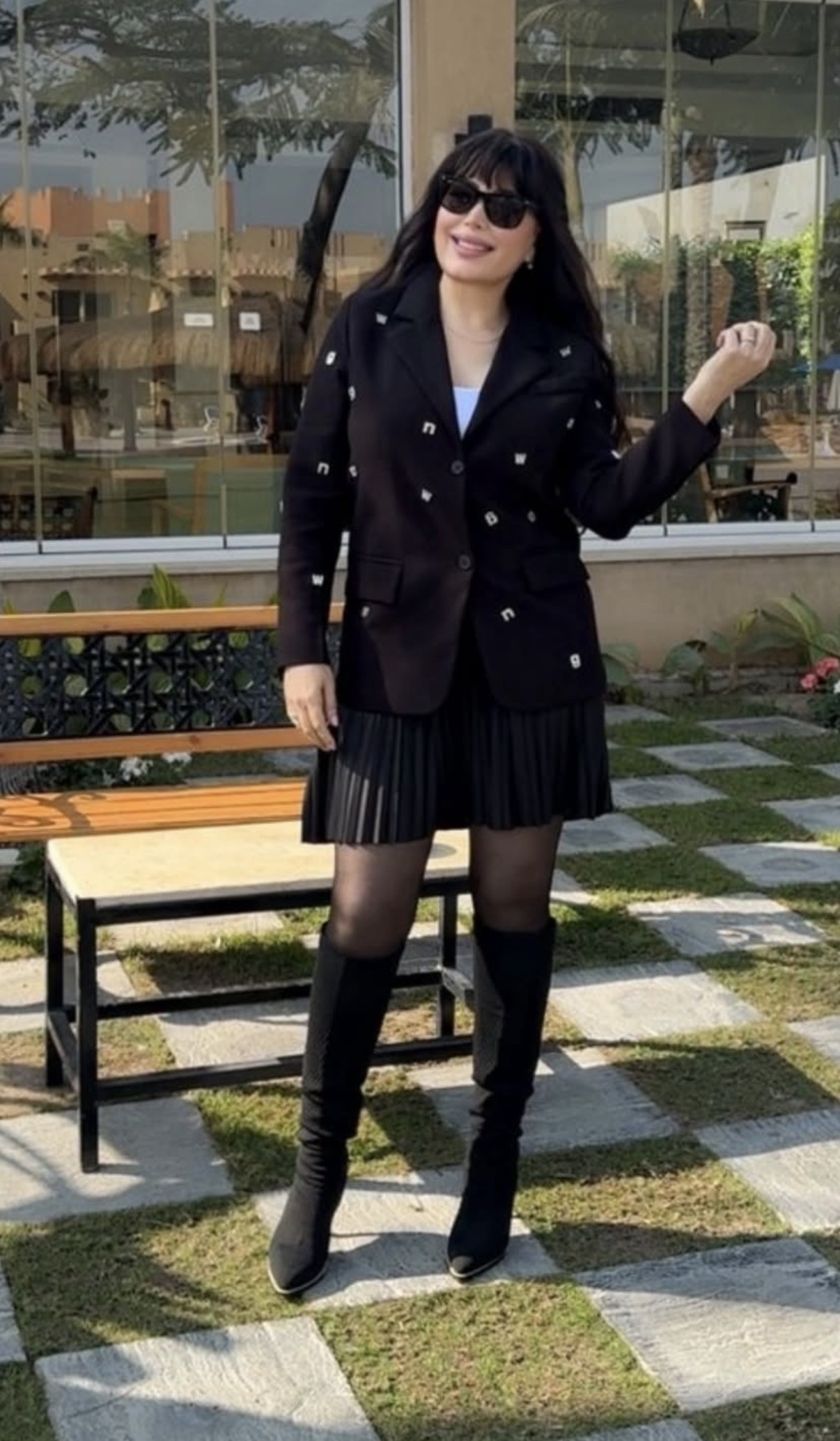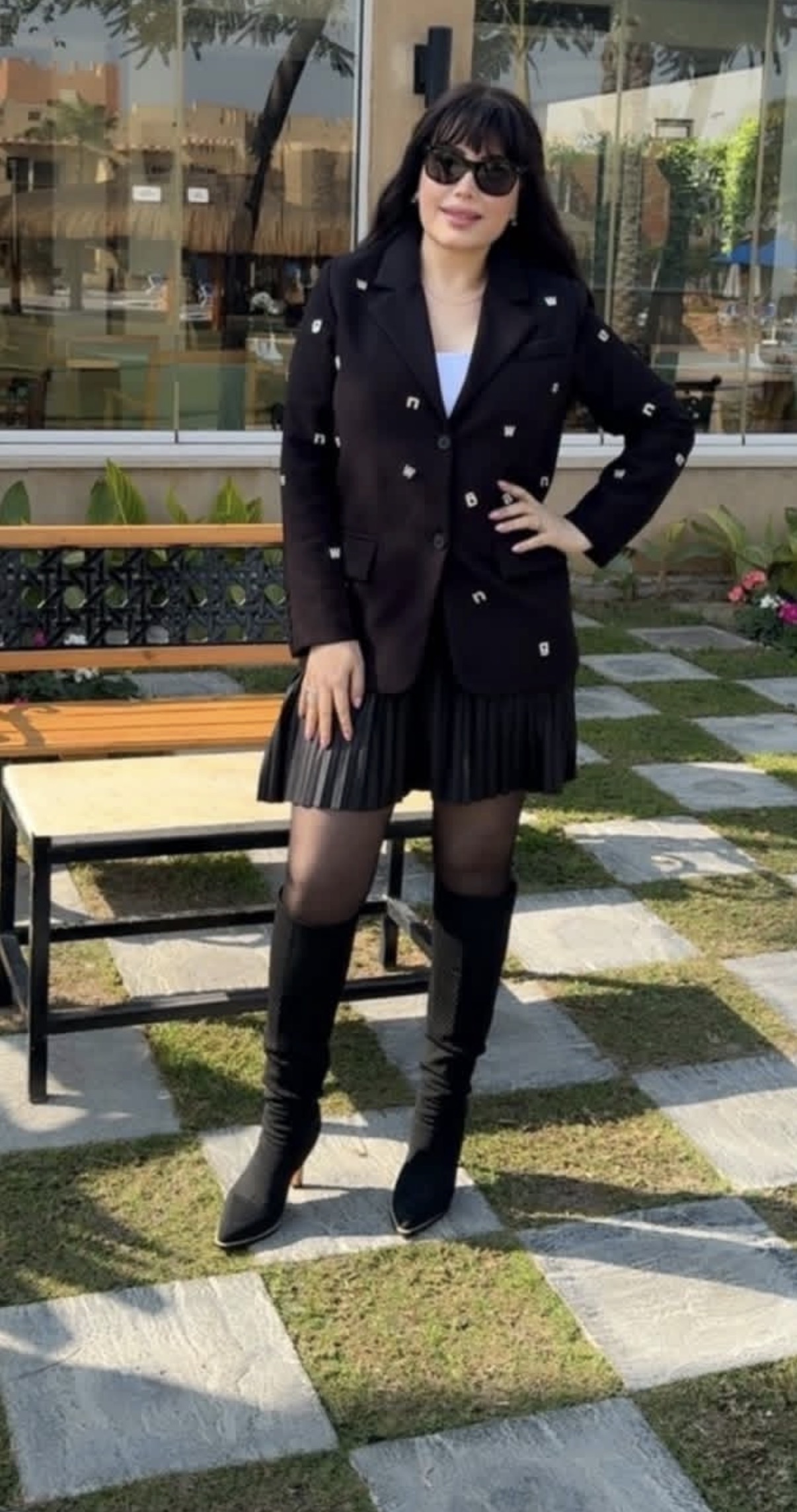 تألقت عبير صبري في الصور بإطلالة شتوية أنيقة، حيث ارتدت جيبة قصيرة للغاية اتسمت بصيحة البليسية مع توب باللون الأبيض، ونسقت معها بليزر باللون الأسود.